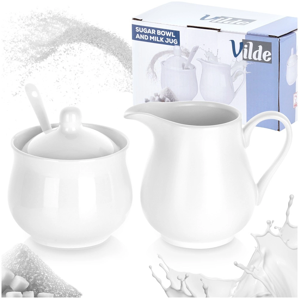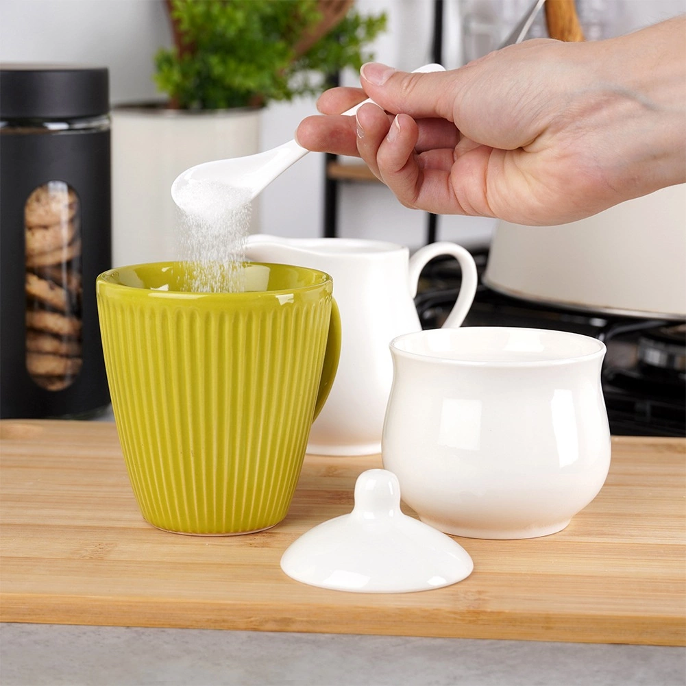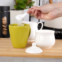 Ten designerski zestaw łączy funkcjonalność i czysty wygląd porcelany. Mlecznik z ergonomicznym uchem i profilowaną wylewką umożliwia precyzyjne nalewanie mleka lub śmietanki, a cukierniczka z pokrywką i praktycznym wycięciem na łyżeczkę utrzymuje cukier w czystości i zawsze pod ręką. Biały kolor łatwo dopasować do każdej zastawy i prezentuje się elegancko na każdym stole.