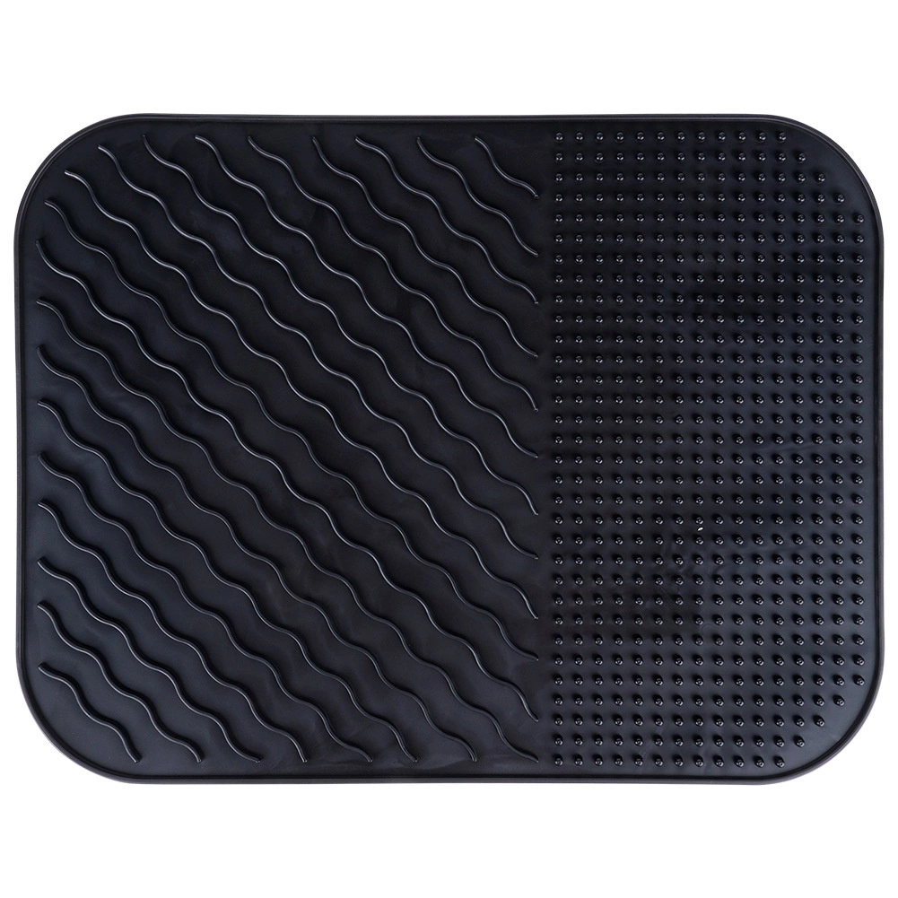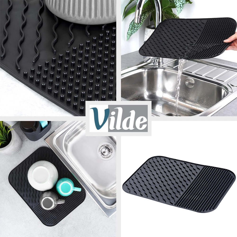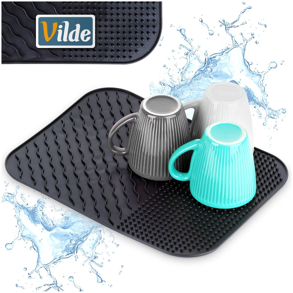 Praktyczna silikonowa mata do suszenia naczyń w eleganckim czarnym kolorze ułatwi codzienne porządki w kuchni. Oferuje dużą powierzchnię na talerze, szklanki i sztućce, odporność na temperatury od -40 °C do 120 °C oraz dwukierunkowe rowki dla szybkiego odprowadzania wody. Jest łatwa do umycia, trwała i oszczędza miejsce na blacie kuchennym.