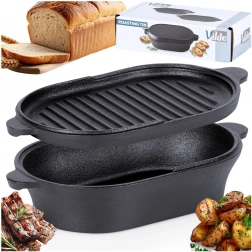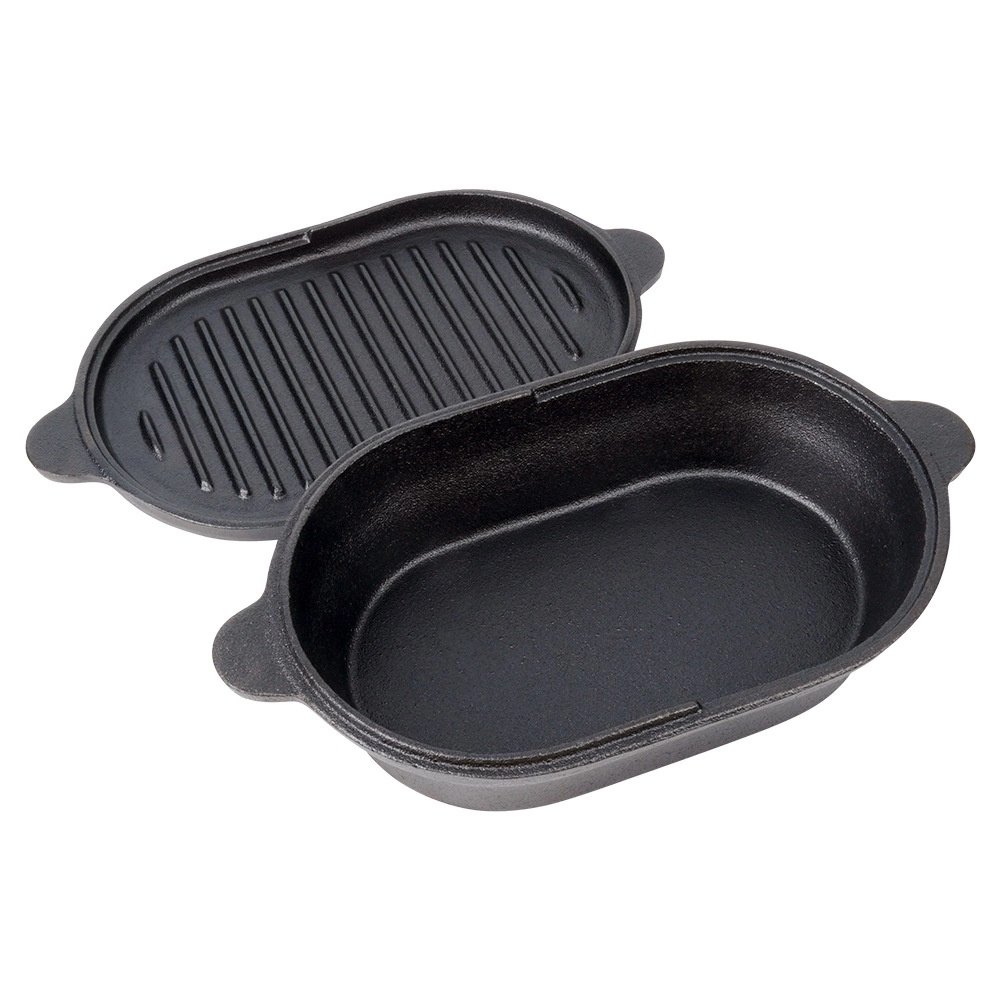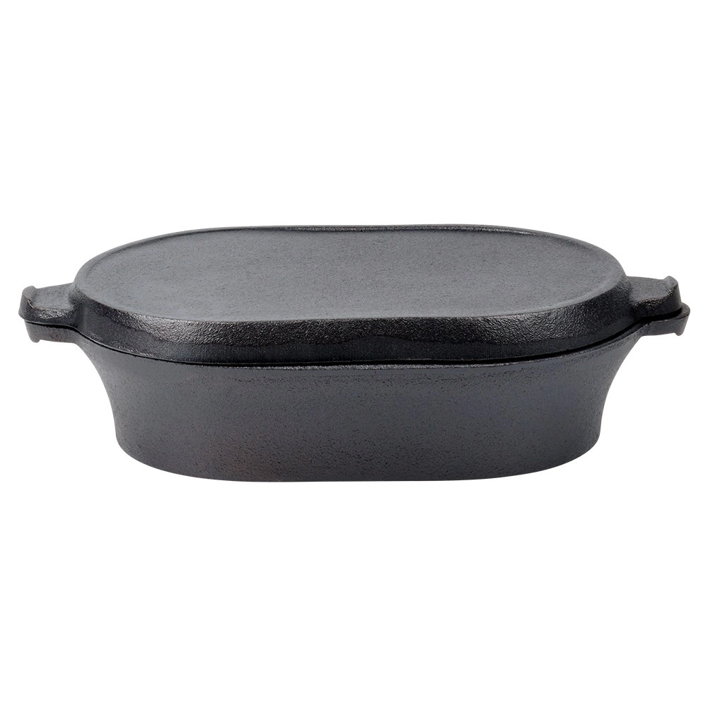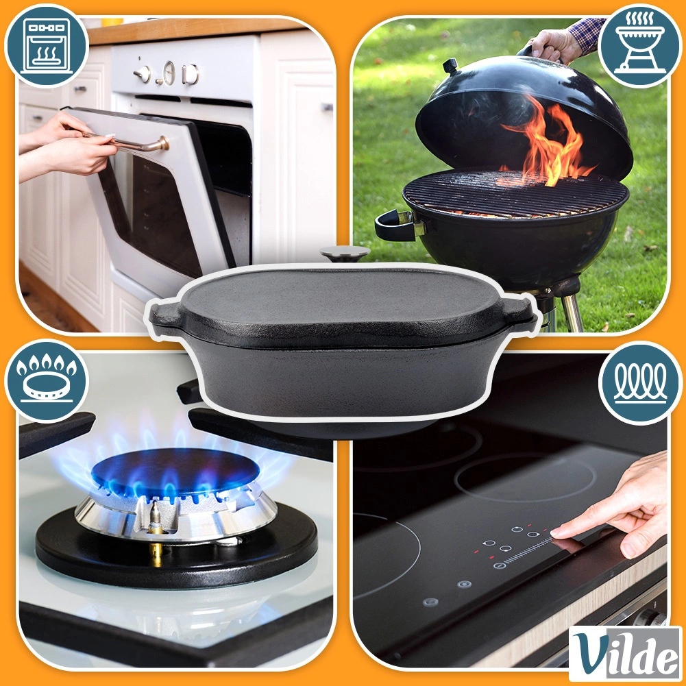 Ta owalna żeliwna brytfanna z praktyczną pokrywą 2w1 została zaprojektowana do codziennego i świątecznego gotowania. Dolna część służy jako głębszy garnek do mięsa, ziemniaków czy warzyw, natomiast pokrywa z ryflowanym dnem działa jako samodzielna patelnia grillowa do perfekcyjnego zrumienienia i uzyskania wyraźnych pasków.