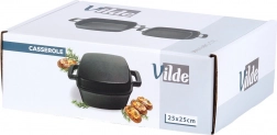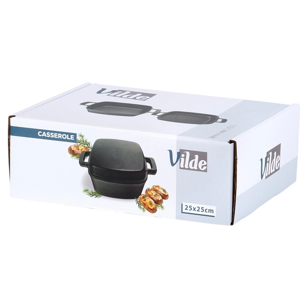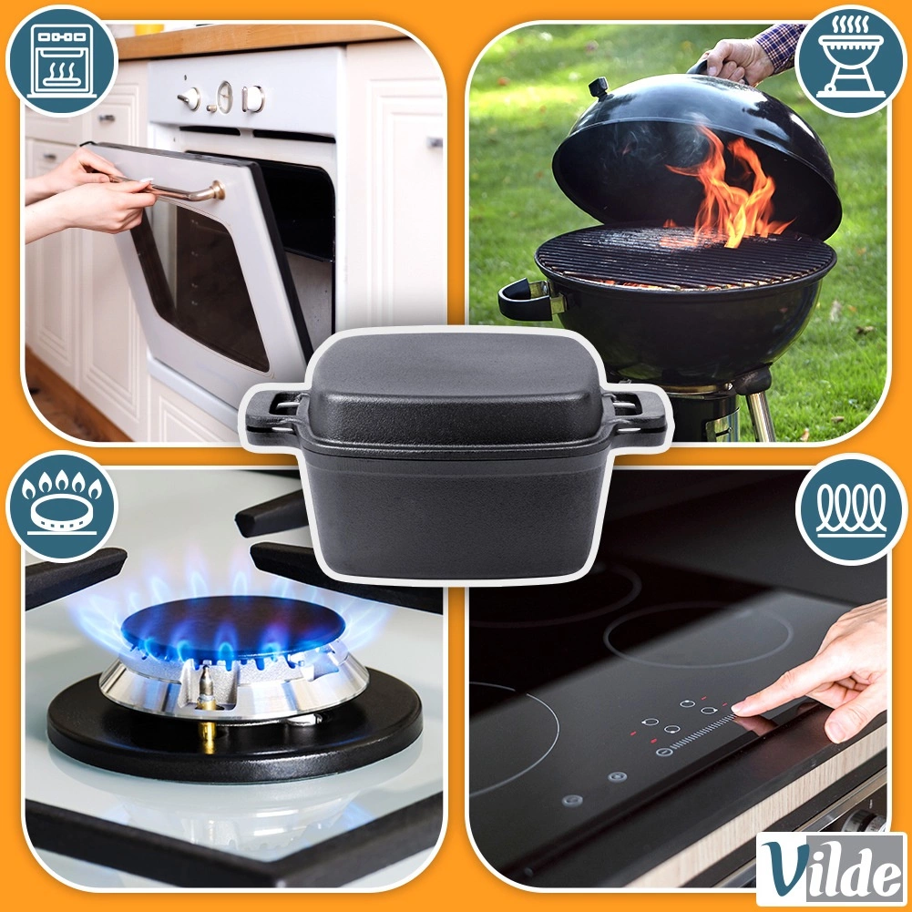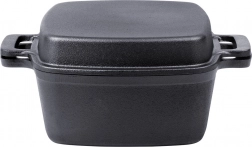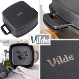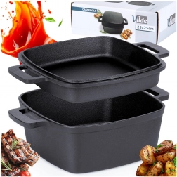 Uniwersalny kwadratowy żeliwny garnek 2w1 z pokrywką, która służy także jako samodzielna patelnia/naczynie do zapiekania. Maswyna żeliwo świetnie przewodzi i akumuluje ciepło, jest odporne na wysokie temperatury i nadaje się na wszystkie typy kuchenek, w tym indukcję, do piekarnika, na grill i nad ogień. Idealny do duszonych potraw, pieczenia, gotowania zup, gulaszy i dań zapiekanych. Oryginalny produkt VILDE z linii CAST LINE.