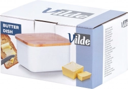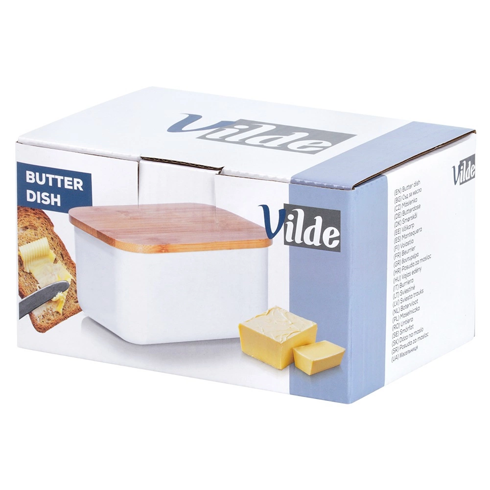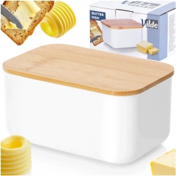 Ta praktyczna maselniczka jest idealna do przechowywania masła w lodówce oraz do jego eleganckiego serwowania na stole. Solidne stalowe wykonanie z białym lakierem proszkowym oraz naturalna bambusowa pokrywka tworzą nowoczesny i ponadczasowy wygląd, który pasuje do każdego nakrycia stołu.