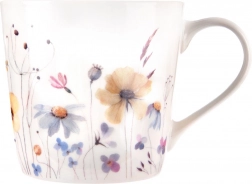 Elegancki porcelanowy kubek o pojemności 430 ml z delikatnym motywem łąkowych kwiatów jest idealny do codziennego picia herbaty, kawy i kakao. Ma wygodne ucho, klasyczny kształt oraz błyszczącą glazurę ułatwiającą czyszczenie. Nadaje się do zmywarki i kuchenki mikrofalowej.