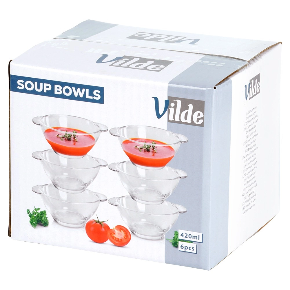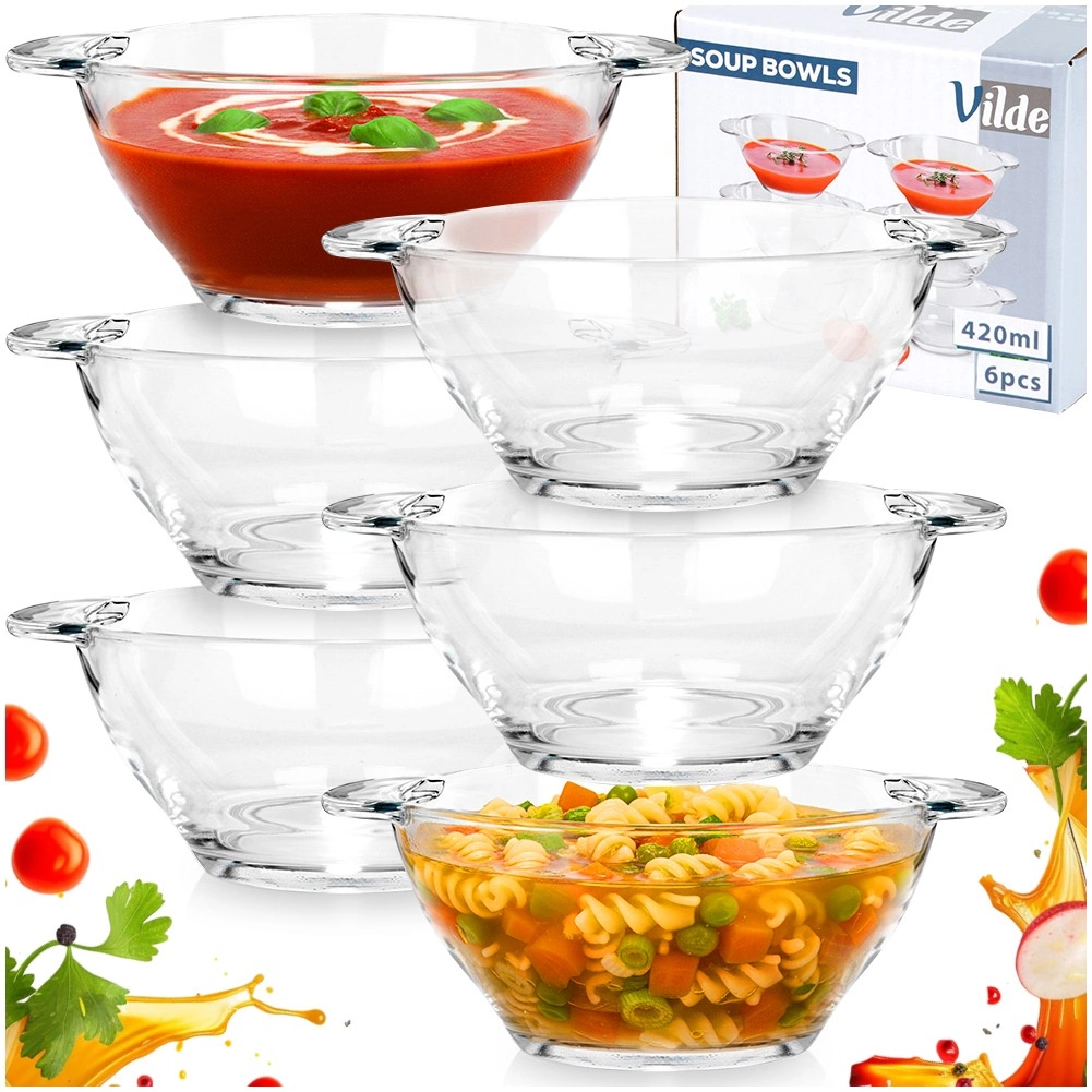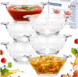 Elegancki zestaw 6 szklanych misek do zupy o pojemności 420 ml z praktycznymi bocznymi uchwytami. Idealne do serwowania zup, bulionów i kremów, a także jogurtów, płatków, owoców i deserów. Wytrzymałe przezroczyste szkło zapewnia piękną prezentację potraw, miski są odpowiednie do zmywarki i dzięki wygodnym uchwytom łatwo się przenoszą.