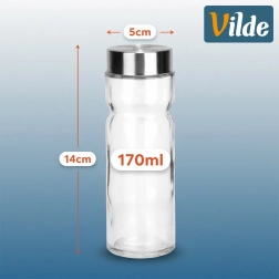 Grube, przezroczyste szkło i solidne metalowe zakrętki w eleganckim, srebrnym wykończeniu łączą długą żywotność z łatwą kontrolą zawartości.