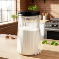 Przezroczyste, żebrowane szkło łączy styl i funkcjonalność – łatwo widzisz zawartość, a pojemnik dobrze leży w dłoni.