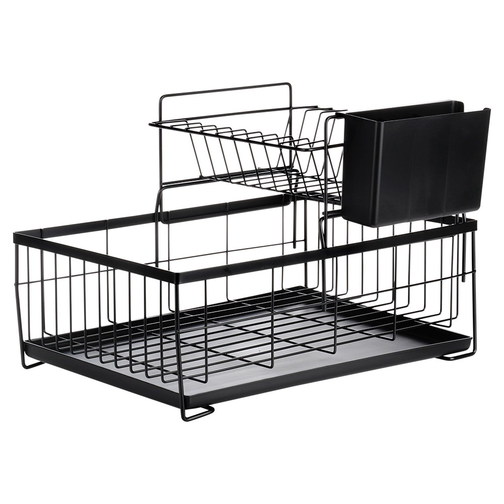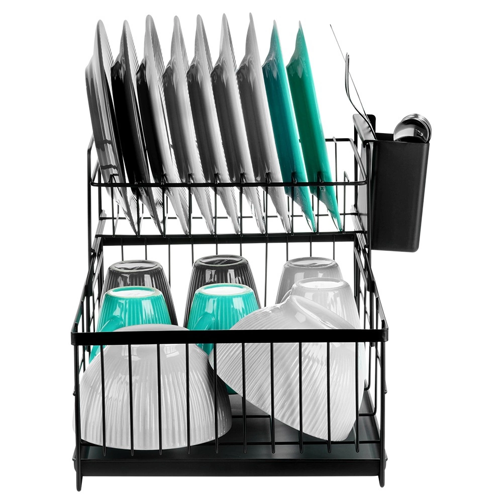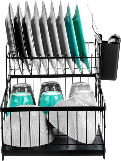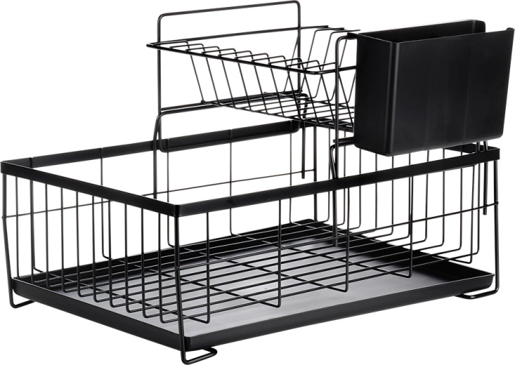 Utrzymaj porządek i suchość w kuchni dzięki dwupoziomowemu ociekaczowi, który pomieści talerze, kubki, miski i sztućce. Wytrzymały metal w matowej czerni gwarantuje długą żywotność i łatwą pielęgnację, a wyjmowana tacka ociekowa zbiera wodę i chroni blat.