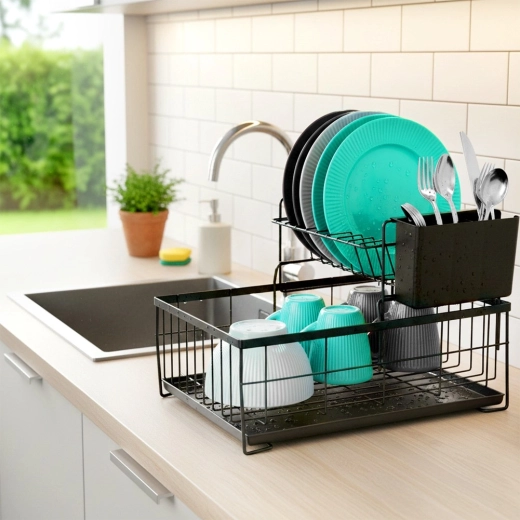 Praktyczna, dwupoziomowa suszarka do naczyń w eleganckim, czarnym kolorze oszczędza miejsce na blacie kuchennym i przyspiesza schnięcie. Oferuje dużą pojemność, solidną metalową konstrukcję, wyjmowaną tackę ociekową oraz trzyczęściowy koszyk na sztućce. Stylowy industrialny design pasuje do nowoczesnych i klasycznych kuchni.