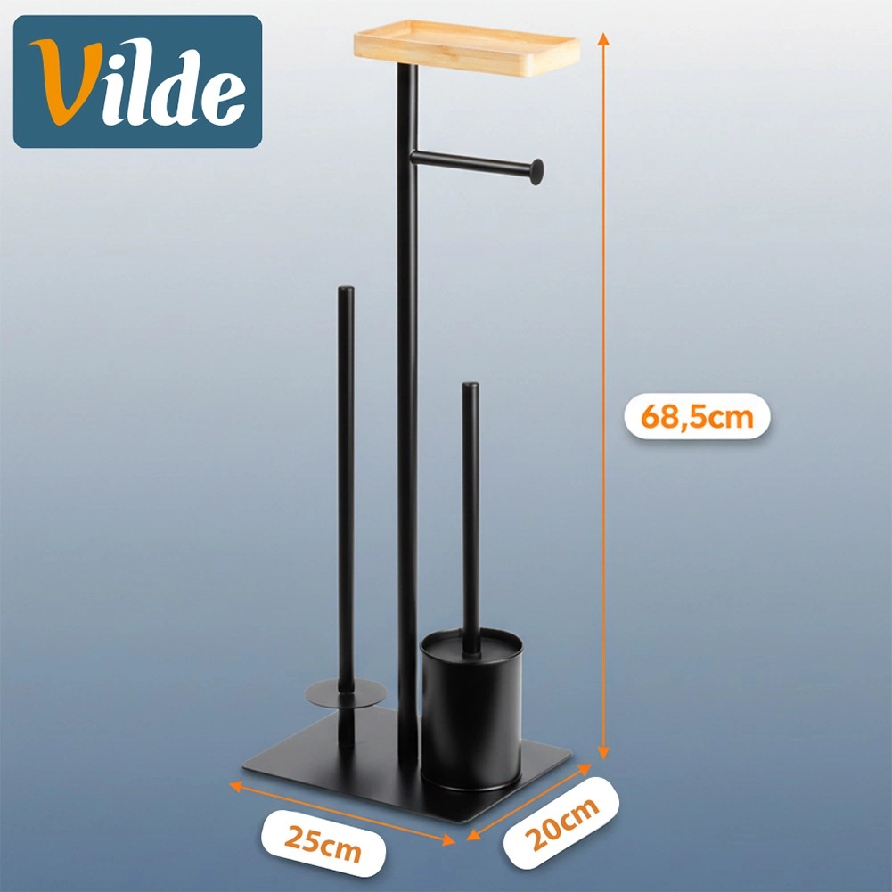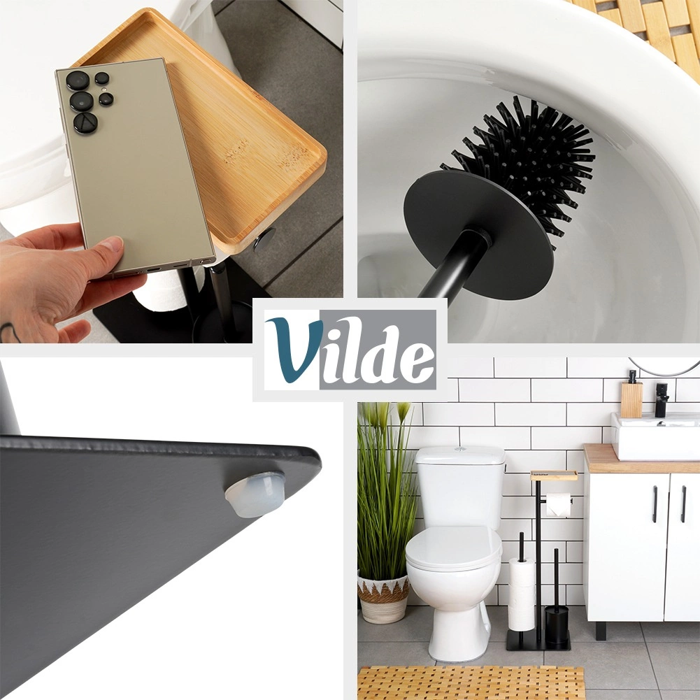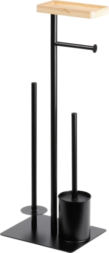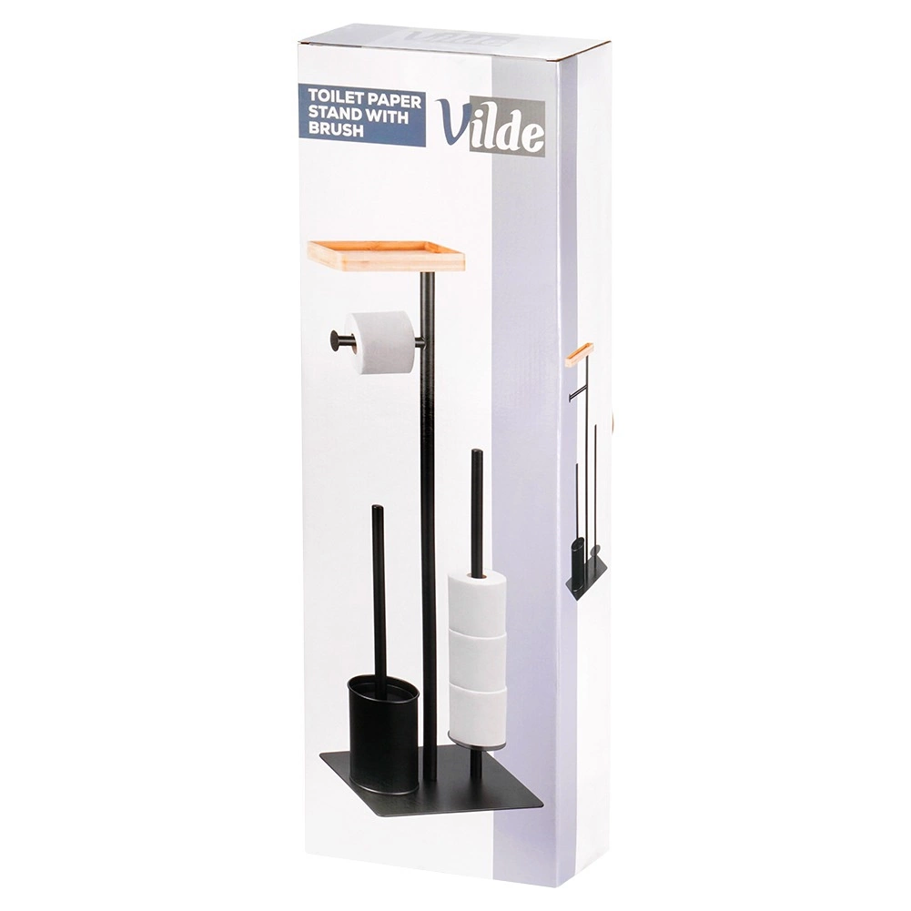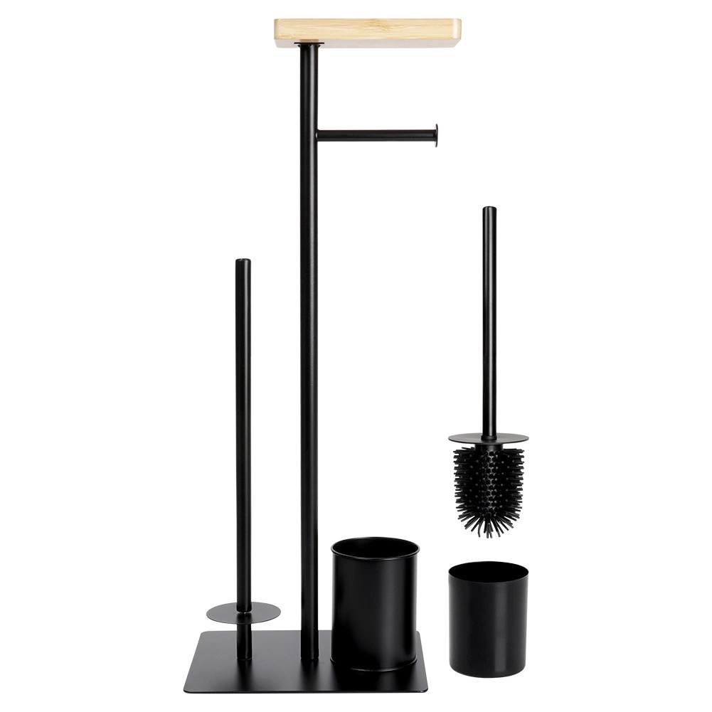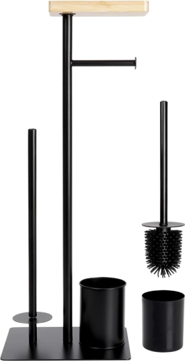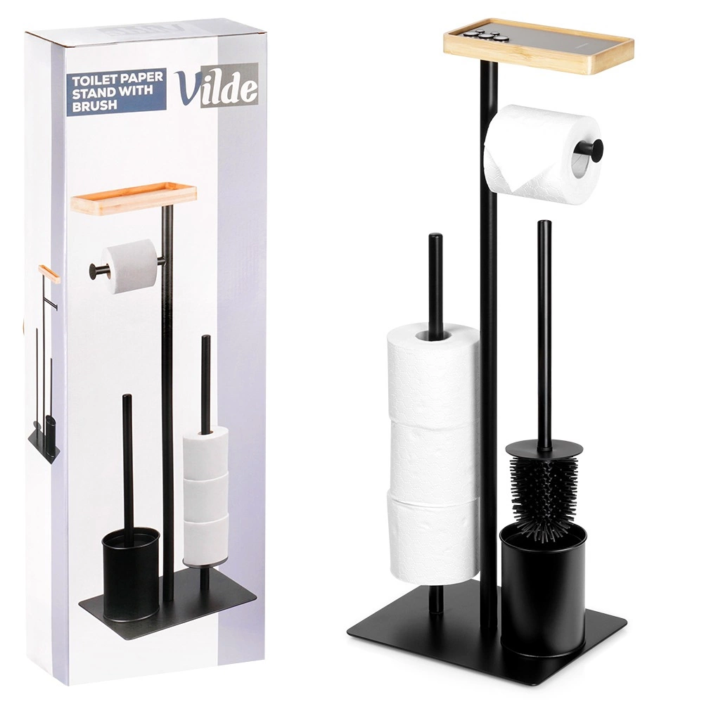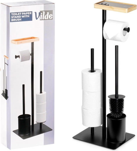 Praktyczny pomocnik 2 w 1 do łazienki: stojak na papier toaletowy ze szczotką w eleganckim czarnym kolorze. Oferuje uchwyt na aktualną rolkę, miejsce na 3 zapasowe rolki, szczotkę WC z silikonowym włosiem oraz bambusową półkę na telefon. Kompaktowe wymiary 25 × 20 × 68,5 cm i stabilna metalowa konstrukcja gwarantują porządek i wygodę w każdej łazience.