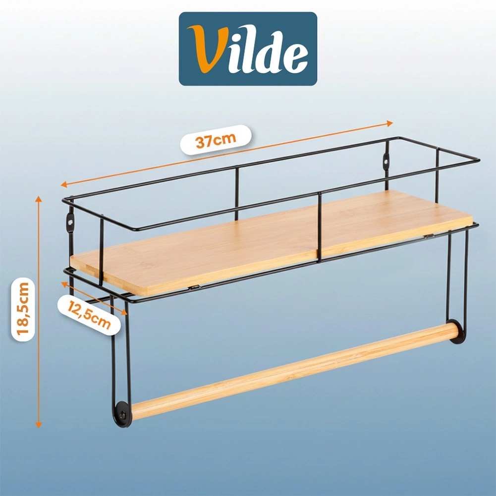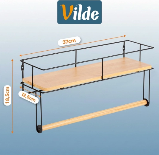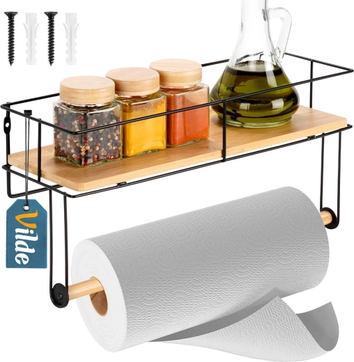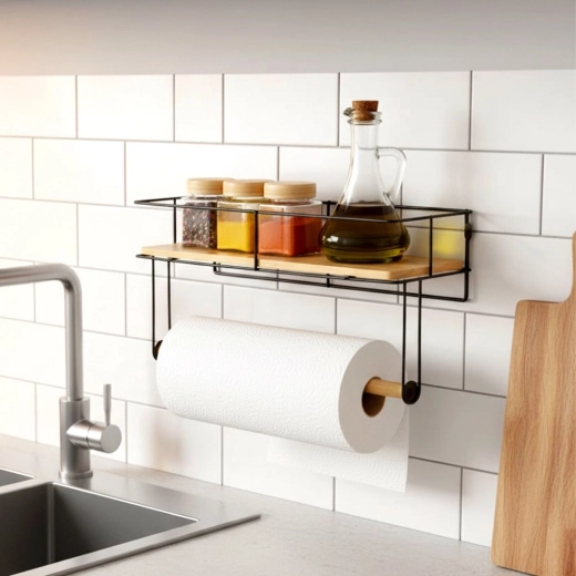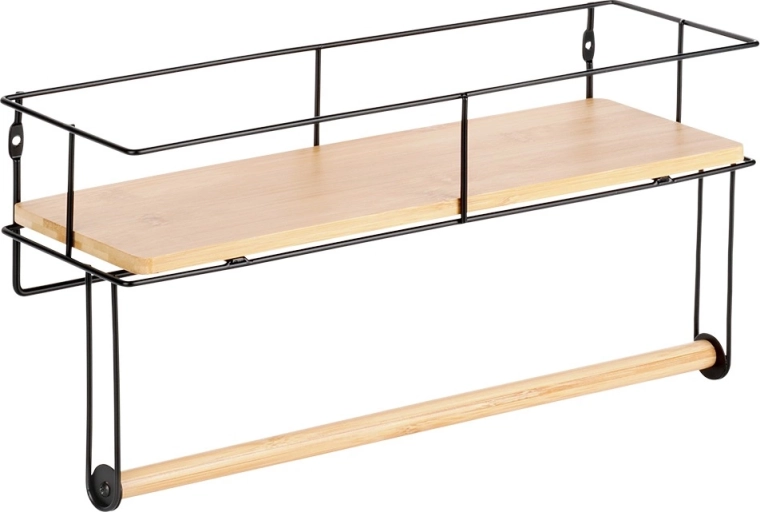 Praktyczny wiszący uchwyt z półką utrzyma kuchnię w porządku i wszystko pod ręką. Oferuje uchwyt na papierowe ręczniki, półkę na przyprawy i drobiazgi, solidną metalową konstrukcję z lakierem proszkowym oraz łatwy montaż na ścianie. Drewniane elementy z bambusa dodają eleganckiego wyglądu.