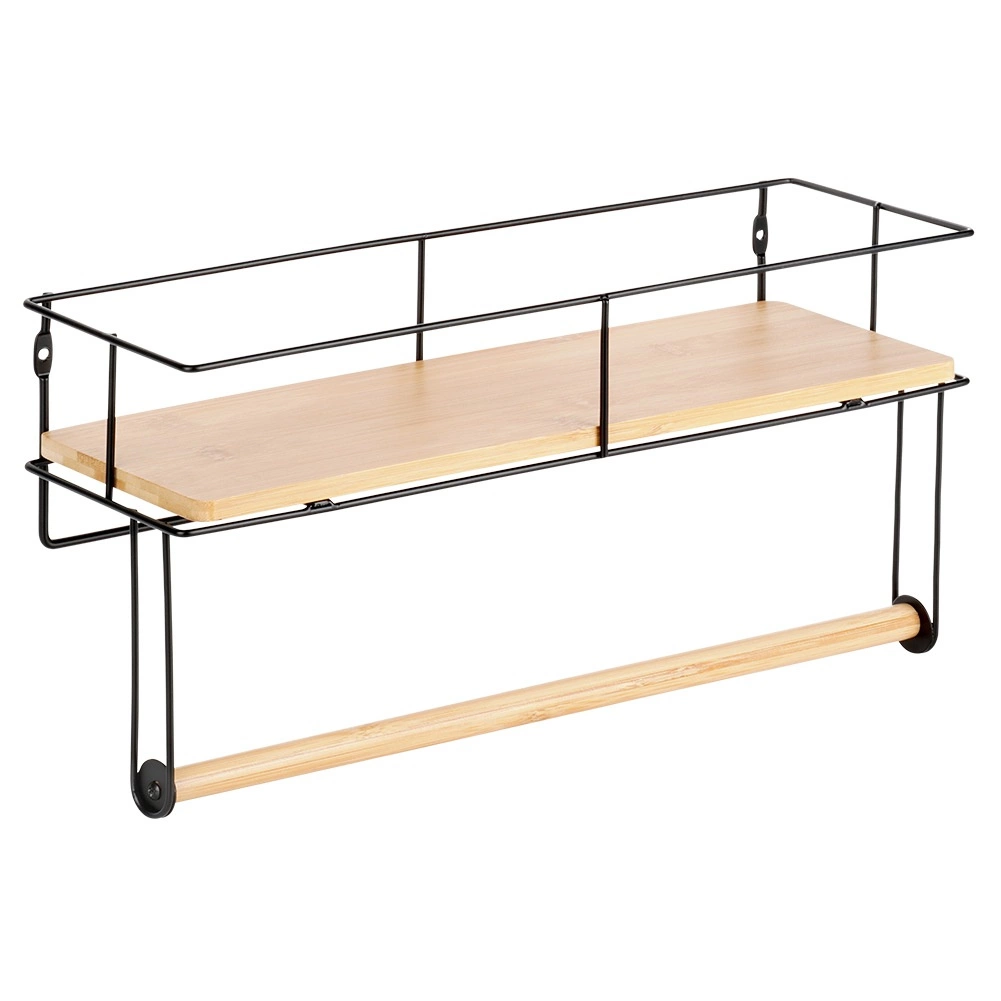 Oszczędzaj miejsce na blacie kuchennym i miej wszystko w zasięgu ręki. Ten funkcjonalny uchwyt na papierowe ręczniki z półką łączy stabilne metalowe wykonanie z czarną proszkową powłoką oraz bambusowymi detalami dla nowoczesnego, industrialnego wyglądu.