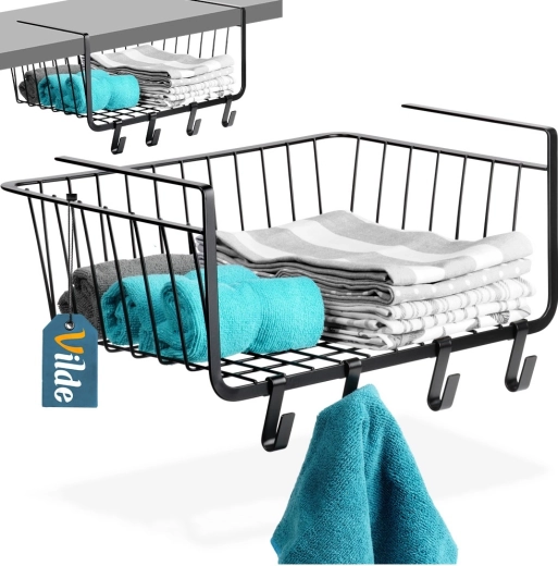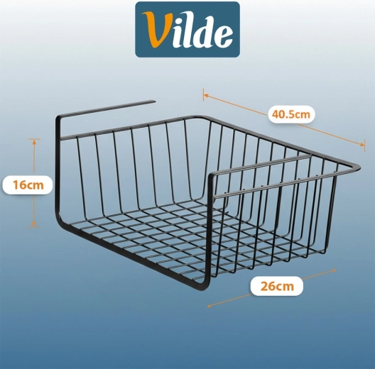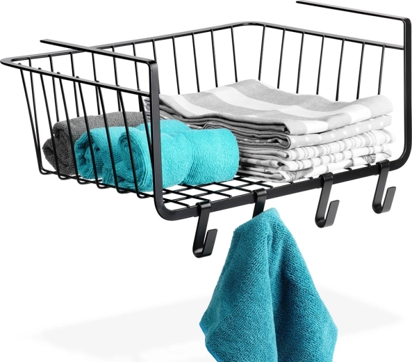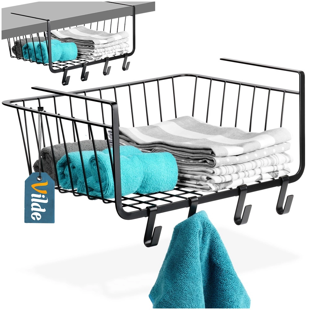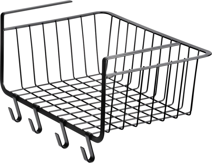 Praktyczny wiszący koszyk pod półkę o wymiarach 40,5 × 26 × 16 cm zwiększy przestrzeń do przechowywania bez wiercenia. W zestawie znajdują się cztery haczyki do zawieszania ściereczek lub akcesoriów. Koszyk wykonany jest z trwałego metalu w czarnym kolorze, ma uniwersalne zastosowanie w kuchni, łazience, garderobie i biurze oraz umożliwia szybki montaż bez narzędzi.