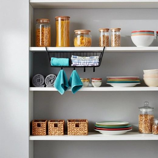 Zorganizuj dom sprytnie i bez wiercenia. Wiszący koszyk łatwo nasuniesz pod półkę lub na reling szafki i natychmiast zyskasz dodatkową przestrzeń do przechowywania na przejrzyste ułożenie akcesoriów kuchennych, łazienkowych czy tekstyliów. W opakowaniu znajdują się 4 praktyczne haczyki do zawieszania ściereczek, rękawic kuchennych lub drobnych dodatków.