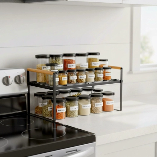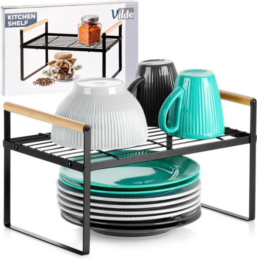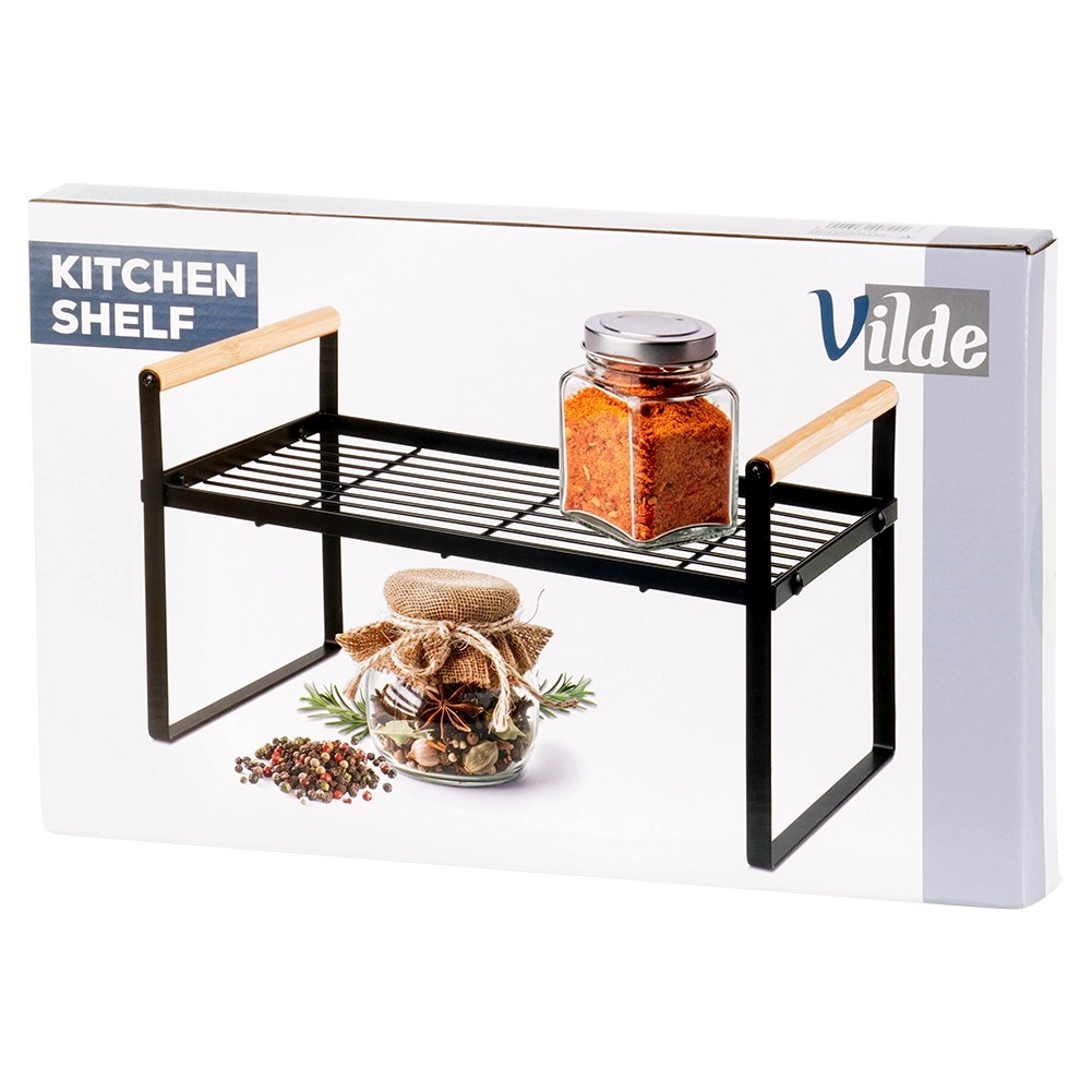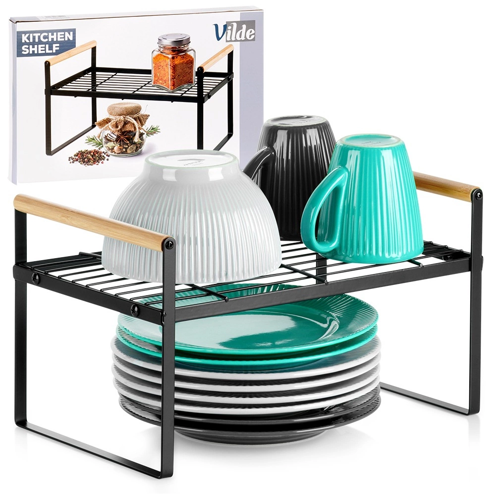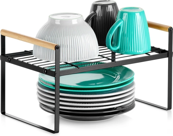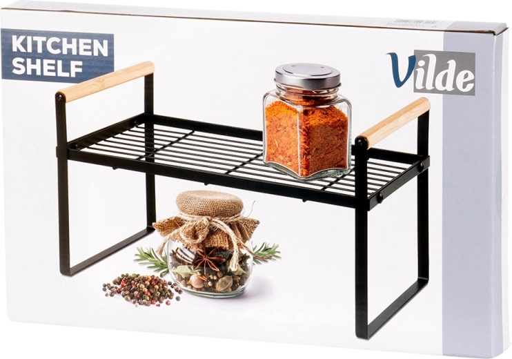 Praktyczna kuchenna półka do lepszej organizacji przestrzeni w kuchni i domu. Oferuje oszczędność miejsca, stabilną metalową konstrukcję w czarnym kolorze oraz bambusowe uchwyty. Dzięki wymiarom 33 × 21 × 19,5 cm efektywnie dzieli szafkę na dwie półki i umożliwia przejrzyste przechowywanie przypraw, talerzy, kubków czy misek.