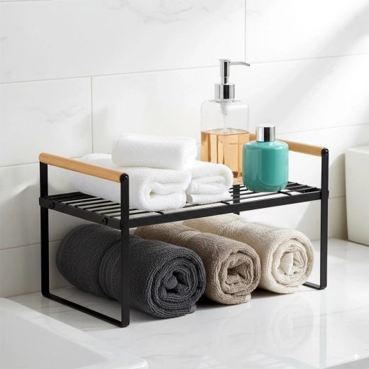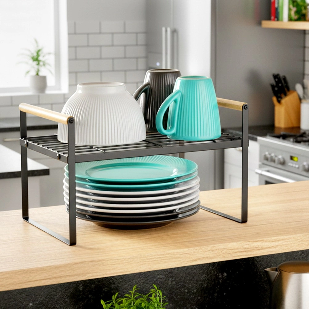 Wykorzystaj każdy centymetr swojej kuchni. Ta uniwersalna półka z wytrzymałego metalu z eleganckim czarnym wykończeniem i bambusowymi uchwytami zapewnia solidność, stabilność i nowoczesny design. Idealnie sprawdzi się w szafkach, na blacie roboczym i w spiżarni, łatwo tworząc drugą poziomą powierzchnię do przechowywania.