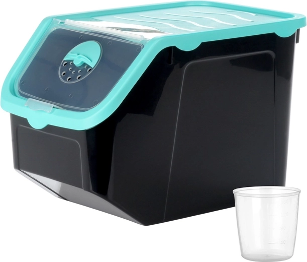 - czarny pojemnik, turkusowa pokrywa, przezroczysta klapka