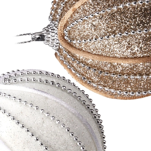 Dodaj swoim świątecznym dekoracjom blask, nowoczesny, a jednocześnie ponadczasowy wygląd. Zestaw 12 sztuk w połączeniu bieli i szampańskiego złota pięknie odbija światło i tworzy świąteczną atmosferę. Powierzchnia z delikatnym brokatem oraz dopracowaną koralikową dekoracją prezentuje się luksusowo i elegancko.