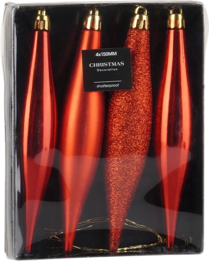 Elegancki zestaw czterech świątecznych ozdób w kształcie sopli w intensywnie czerwonym kolorze doda Twoim dekoracjom blasku i świątecznej atmosfery. Ozdoby są niezbitne, odpowiednie do domów z dziećmi i zwierzętami, a połączenie błyszczącej, matowej i brokatowej powierzchni tworzy wyjątkowy efekt.