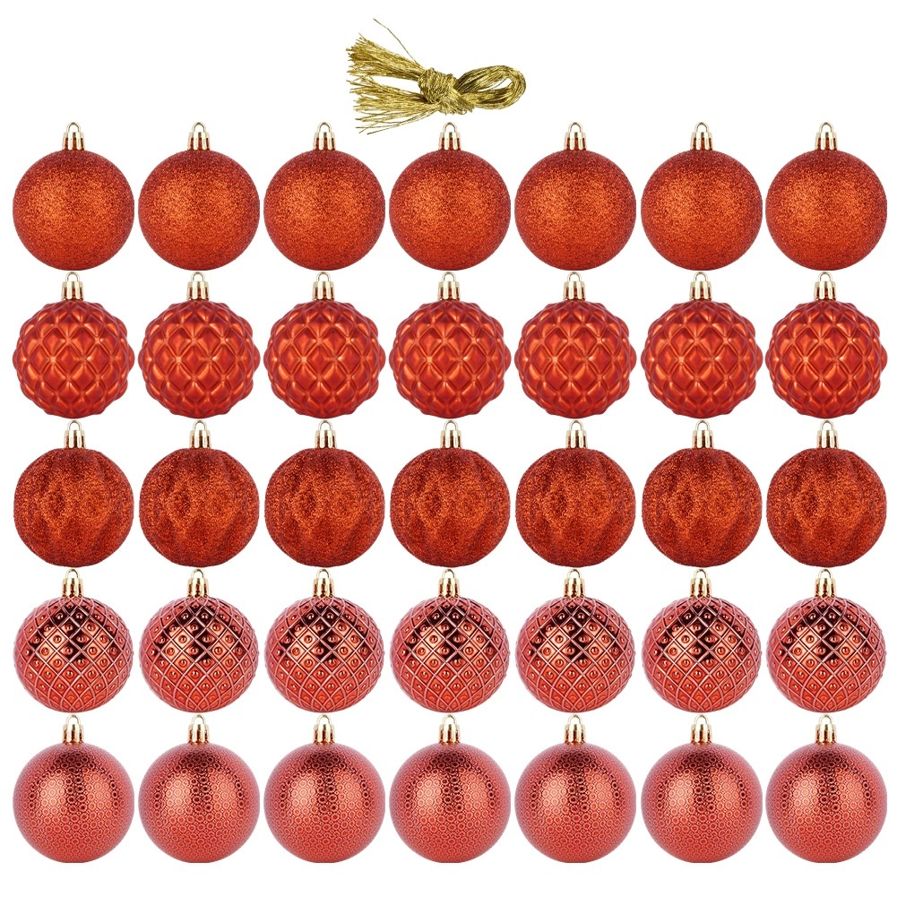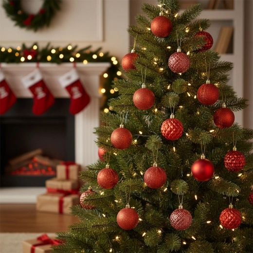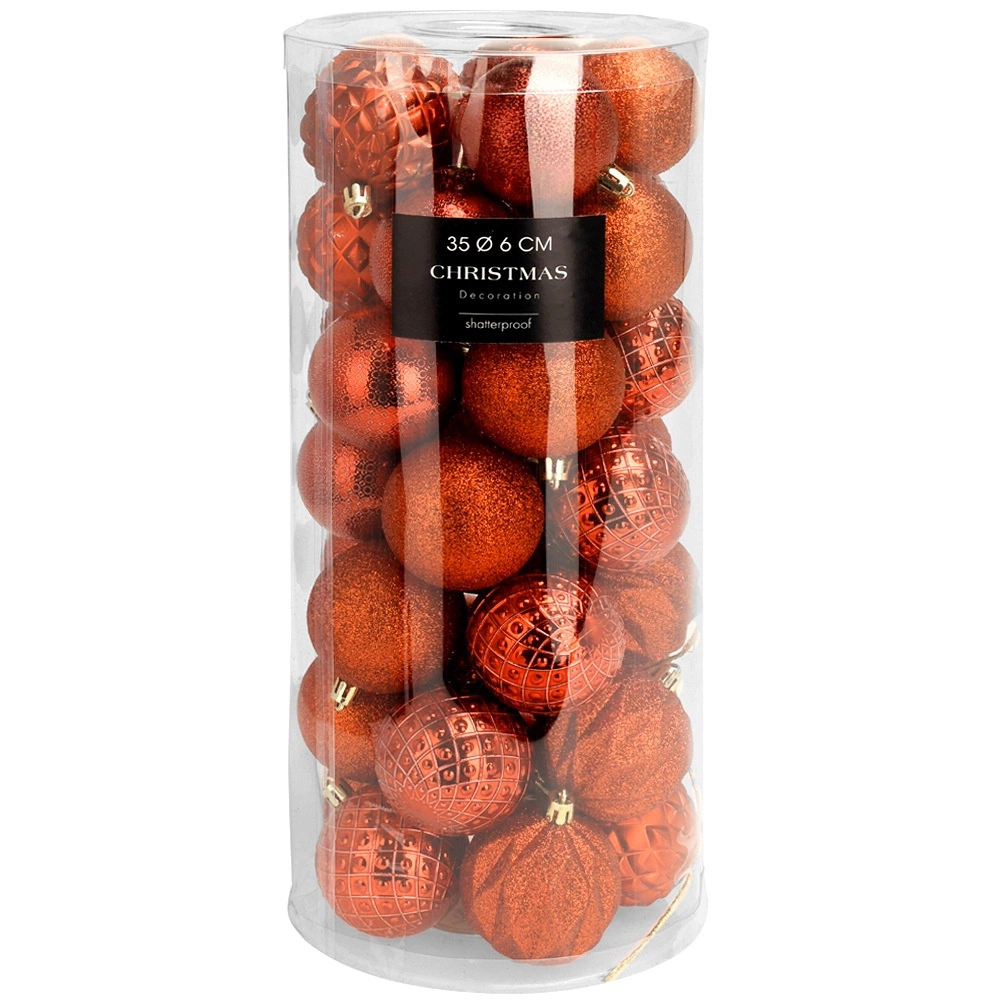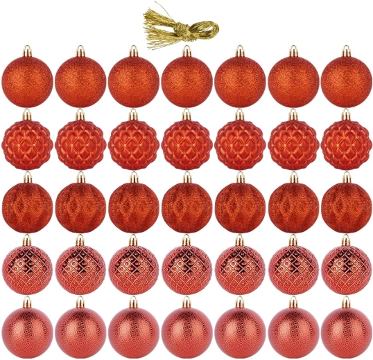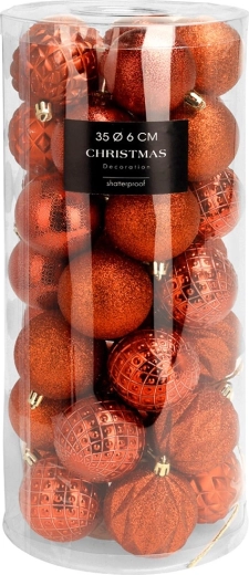 Stylowy zestaw 35 czerwonych bombek choinkowych o średnicy 6 cm dla klasycznego świątecznego wyglądu. Bombki są niestłukące, idealne do domów z dziećmi i zwierzętami. Różne wykończenia powierzchni – połysk, mat i brokat – zapewniają efektowną i urozmaiconą dekorację choinki, wieńców oraz girland.