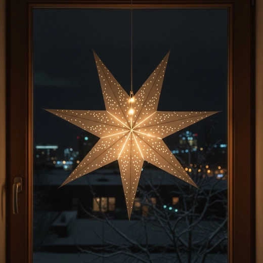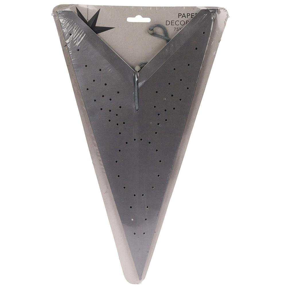 Elegancka, duża papierowa gwiazda o średnicy 75 cm z siedmioma ramionami i ażurowym, perforowanym wzorem. Dzięki lekkiej konstrukcji jest łatwa do zawieszenia w oknie, na ścianie lub pod sufitem. Wykonana z wysokiej jakości szarego papieru z certyfikatem FSC – przyjazna dla środowiska. Idealna jako dekoracja zimowa i całoroczna, świetnie prezentuje się także z lampkami LED (nie są dołączone do zestawu).
