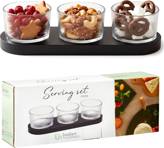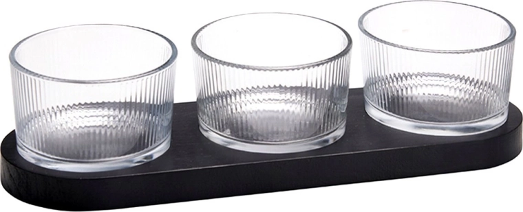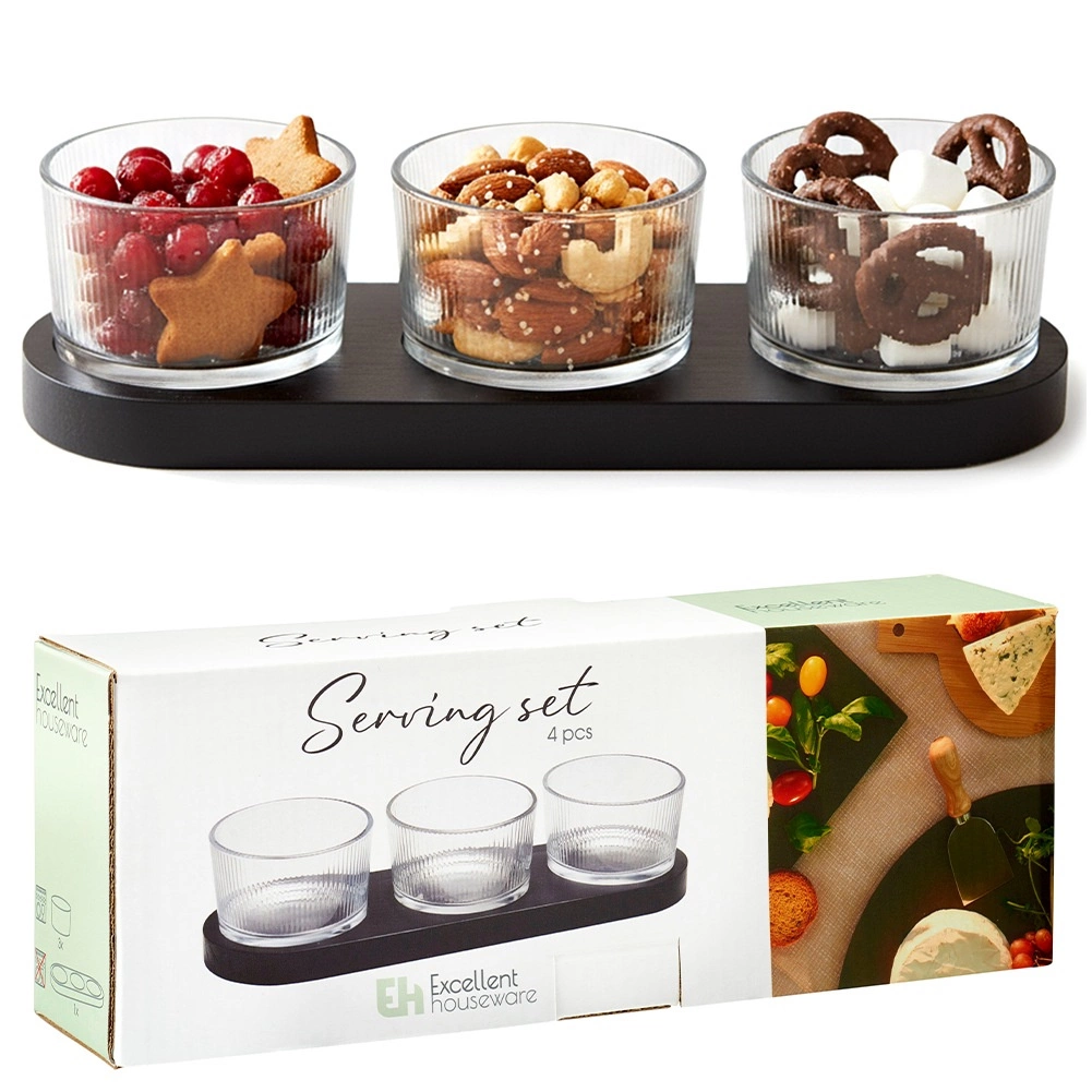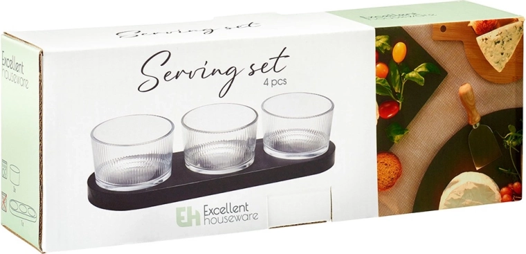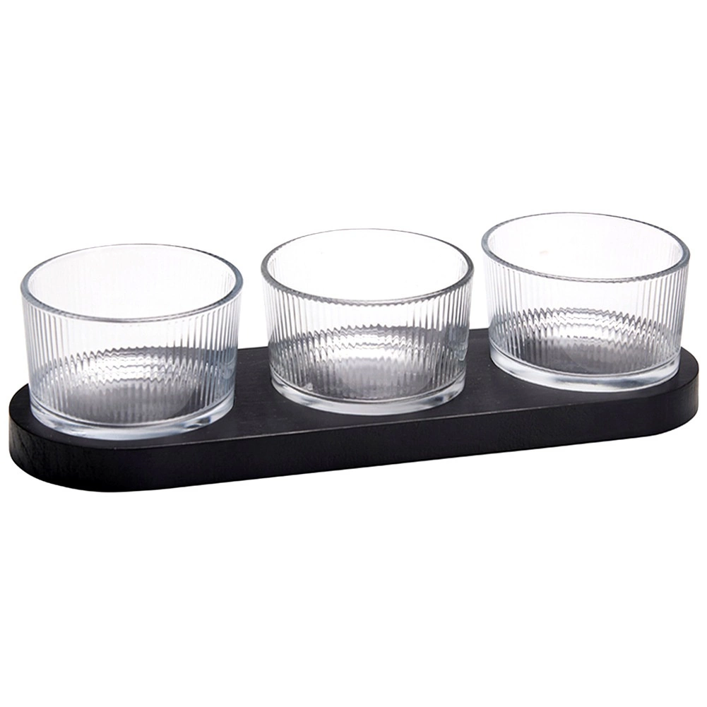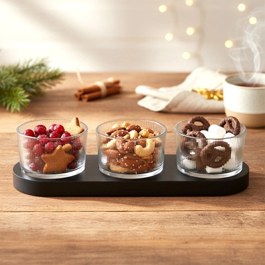 Elegancki, 4‑częściowy zestaw do serwowania przekąsek łączy trzy szklane miseczki oraz prostokątną, drewnianą tacę w czarnym kolorze. Idealny na sosy, dipy, oliwki, orzechy i antipasti. Nowoczesny design z ryflowanym szkłem oraz praktyczne zagłębienia stabilizujące miseczki zapewniają wygodne i stylowe podawanie.