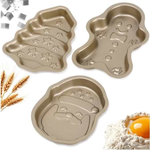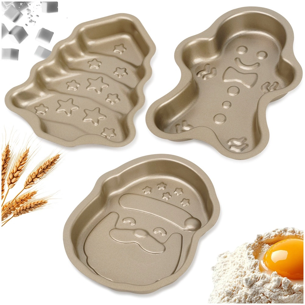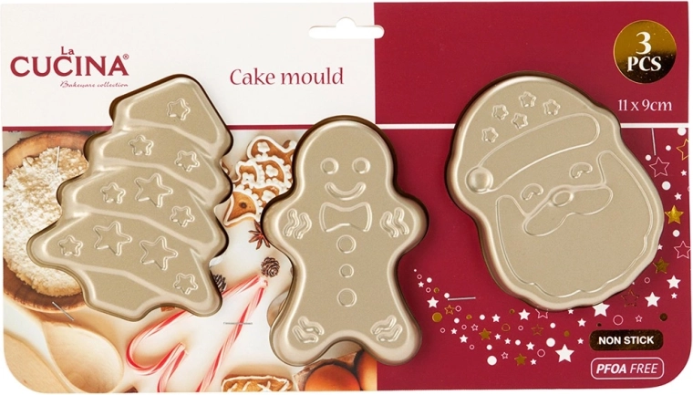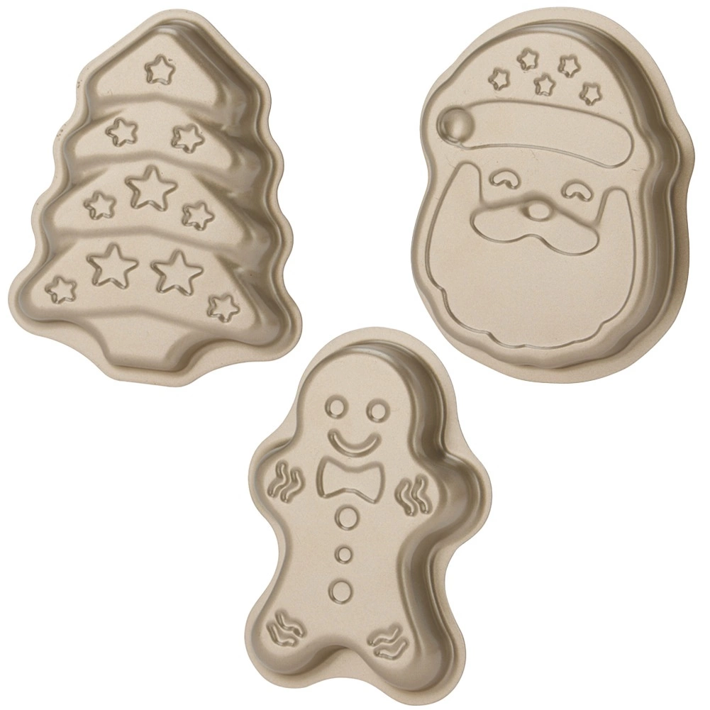 Odkryj praktyczny zestaw trzech foremek do pieczenia w świątecznych kształtach – Święty Mikołaj, ludzik piernikowy i choinka. Wykonane z wytrzymałej stali w kolorze szampańskiego złota, posiadają nieprzywierającą powłokę PTFE ułatwiającą wyjmowanie. Zapewniają równomierne rozprowadzanie ciepła i są odporne na temperaturę do 230 °C, nadają się także do zamrażarki i zmywarki.