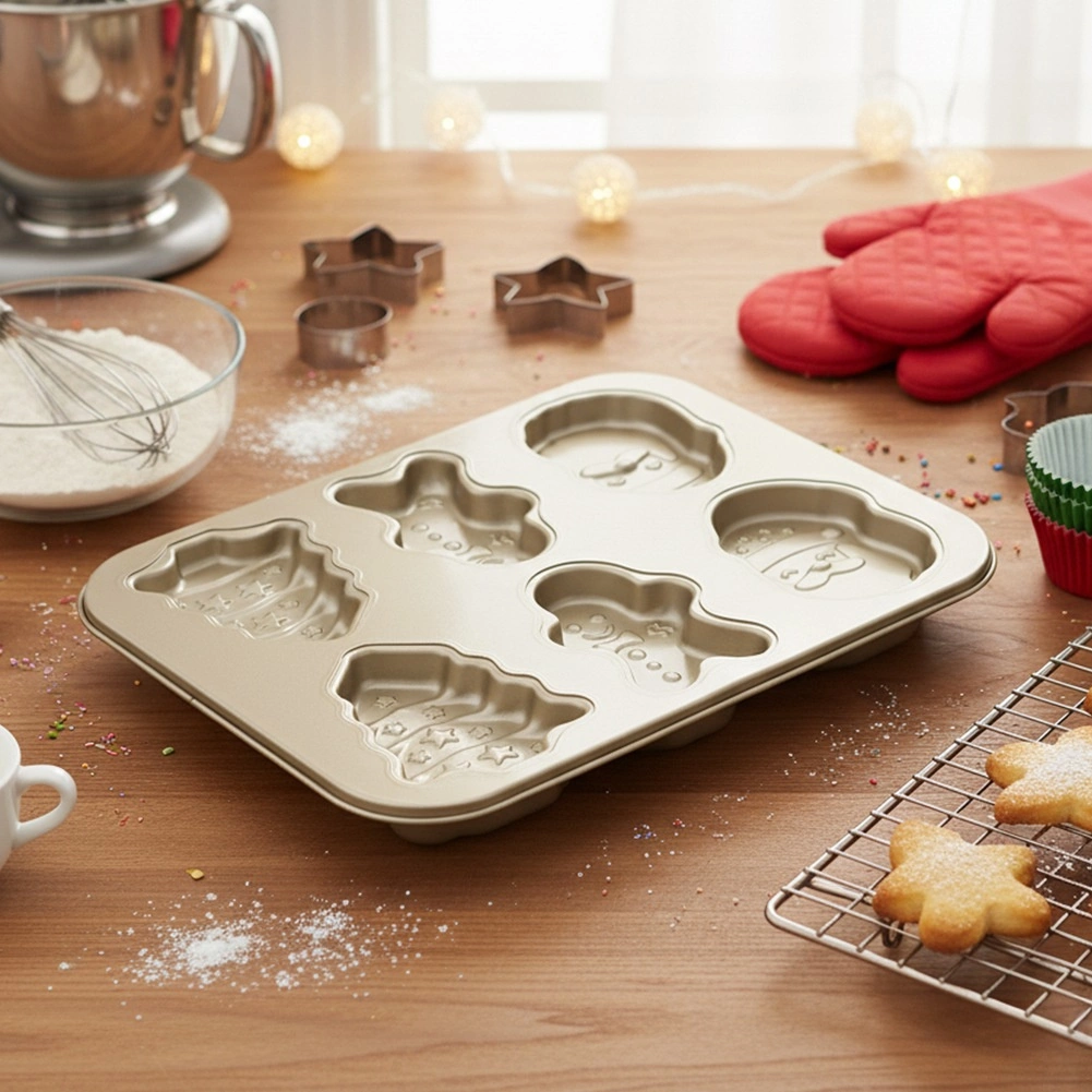 Ta stylowa forma w odcieniu szampańskiego złota oferuje 6 zagłębień z trzema ulubionymi świątecznymi motywami. Świetnie nadaje się na pierniczki, kruche ciasteczka, a także mini serniczki czy cupcake’i. Stalowe korpus zapewnia stabilność i równomierne wypiekanie, a nieprzywierająca powłoka PTFE ułatwia wyjmowanie bez poszarpanych brzegów.