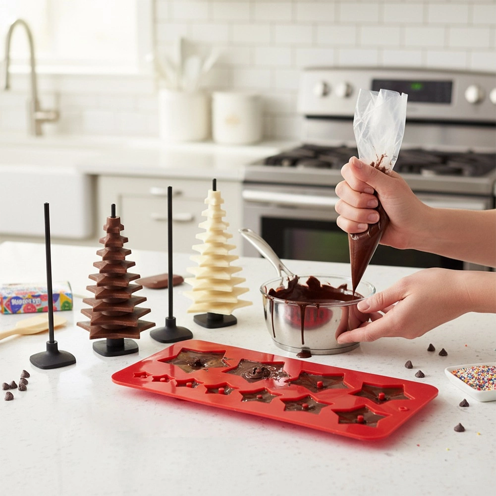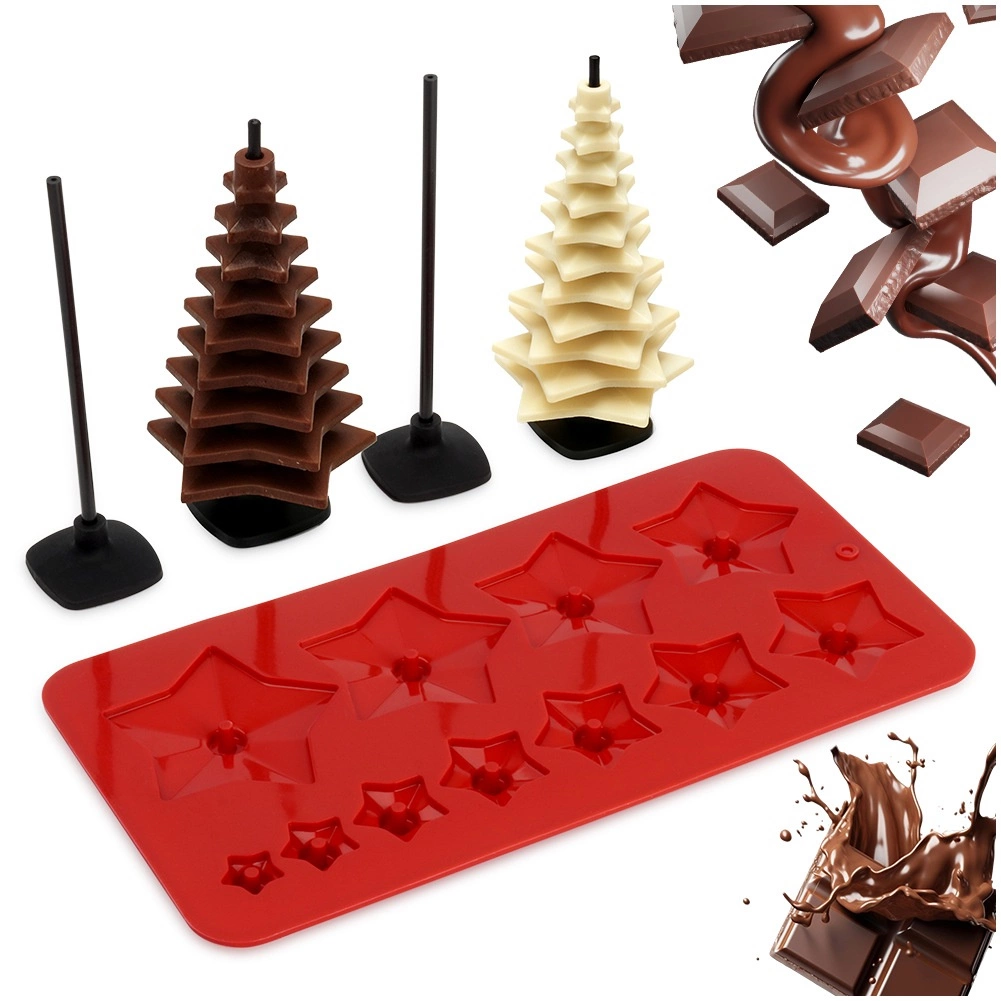Zestaw obejmuje formę na 11 gwiazdek o różnych rozmiarach, 4 patyczki (15 cm) jako rdzeń choinki oraz 4 stabilne silikonowe podstawki. Poszczególne gwiazdki nawlekasz od największej do najmniejszej, tworząc efektowne czekoladowe drzewko – idealne na świąteczne dekoracje i jadalne prezenty.