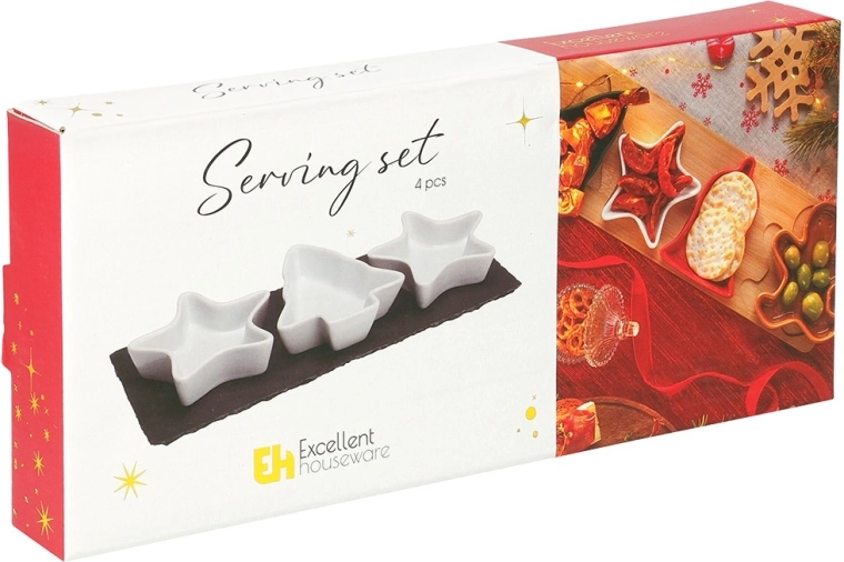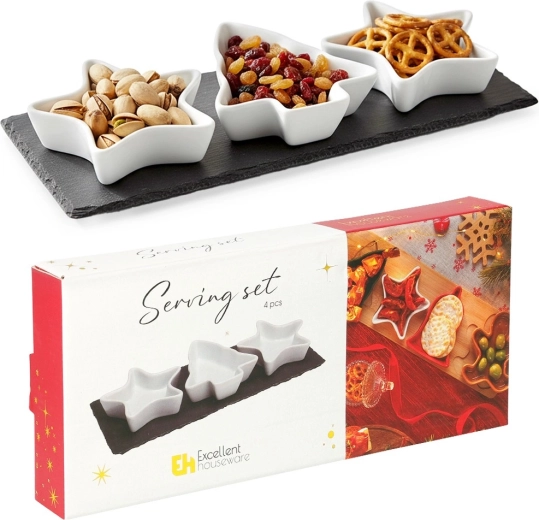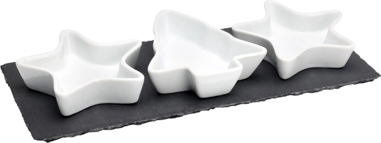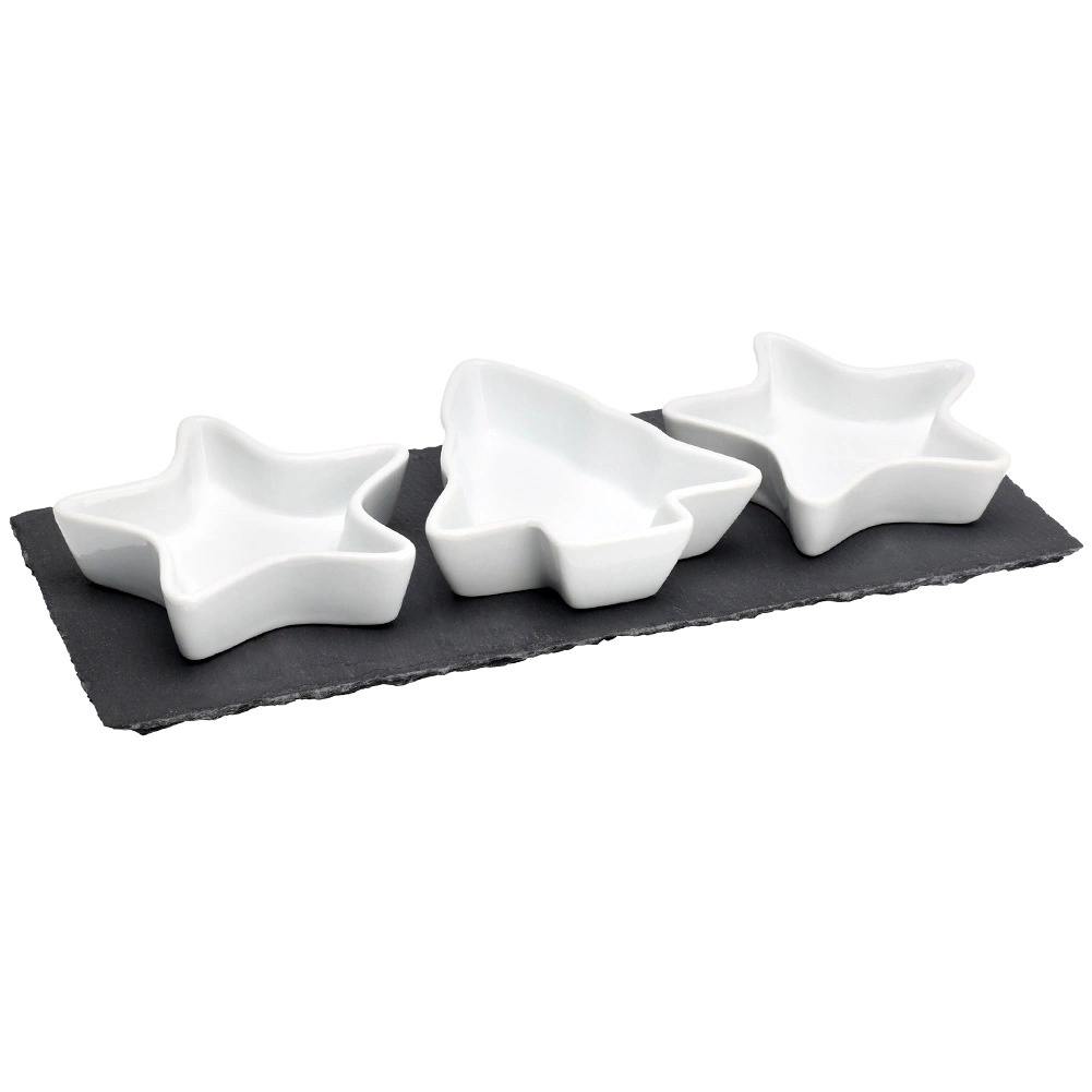 Stylowy zestaw do serwowania przekąsek składa się z trzech porcelanowych miseczek w kształcie gwiazdy i choinki oraz z prostokątnej tacy z łupka. Idealny na orzeszki, oliwki, dip i inne drobne przekąski podczas świątecznych spotkań. Elegancki design, wysokiej jakości porcelana i praktyczne wymiary gwarantują wygodne i efektowne serwowanie.