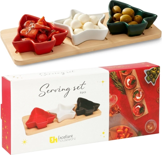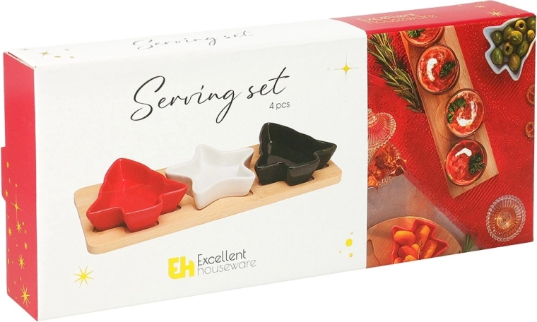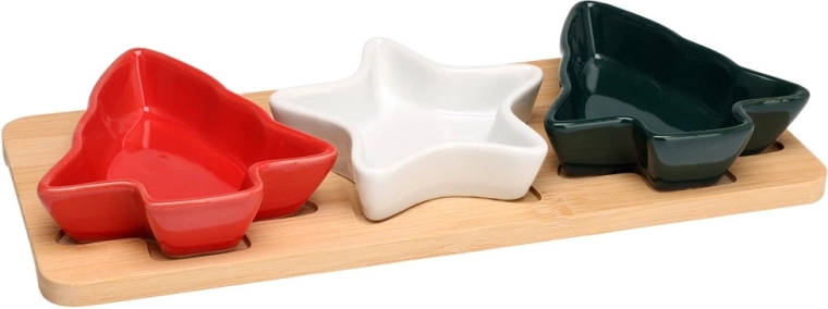 Dzięki świątecznym kształtom zestaw staje się nie tylko praktycznym naczyniem, ale też efektowną dekoracją stołu. Świetnie sprawdzi się na orzechy, oliwki, antipasti, sosy i dipy. To także znakomity prezent dla gospodarzy.