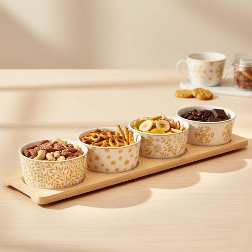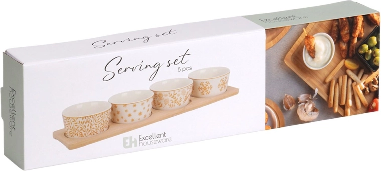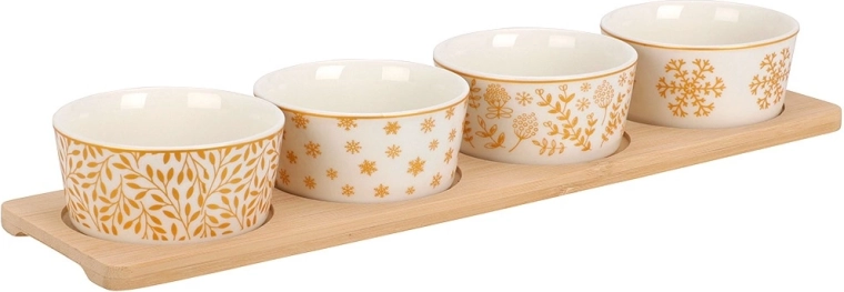 Elegancki, 5‑częściowy zestaw do serwowania zawiera bambusową tacę oraz cztery porcelanowe miseczki z różnymi zimowymi motywami. Idealny na orzeszki, oliwki, dipy i inne drobne przysmaki. Stabilna taca z wycięciami zapobiega przesuwaniu się miseczek, a porcelana jest odpowiednia do zmywarki. Kompaktowe wymiary ułatwiają stylowe serwowanie podczas świątecznych spotkań.