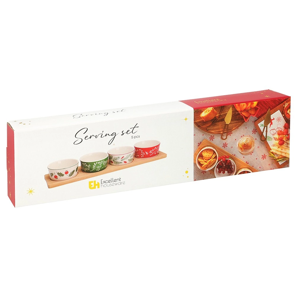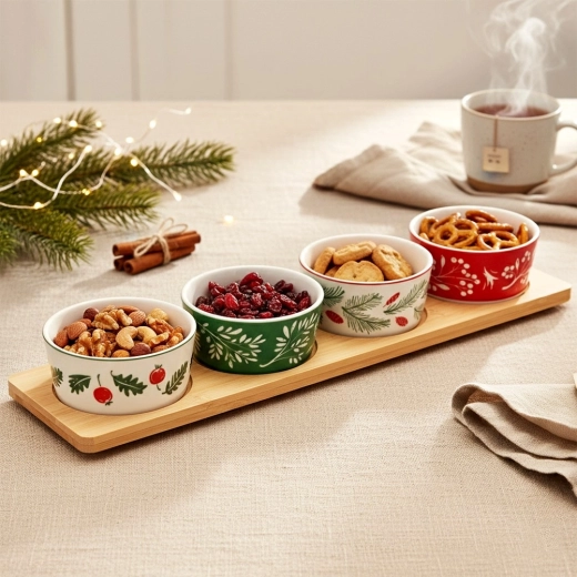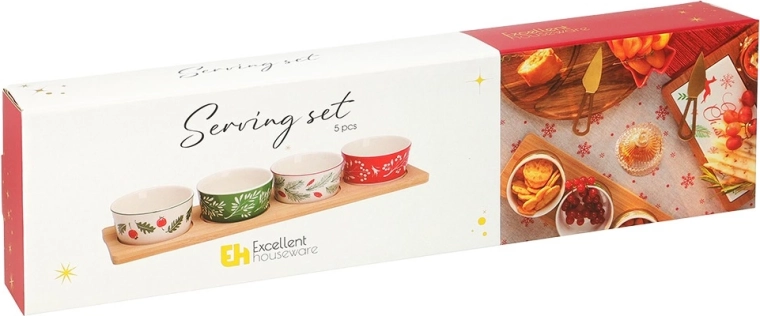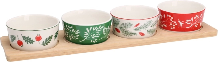 Stylowy zestaw do serwowania z bambusową tacą i 4 porcelanowymi miseczkami z bożonarodzeniowymi motywami. Idealny na orzeszki, oliwki, dipy i drobne przekąski podczas świątecznych spotkań. Stabilne wyprofilowania w tacy zapobiegają przesuwaniu się miseczek, porcelanowe miseczki można myć w zmywarce. Wymiary tacy 38 × 10 × 4,5 cm, miseczki 8,5 × 4 cm, pojemność 140 ml.