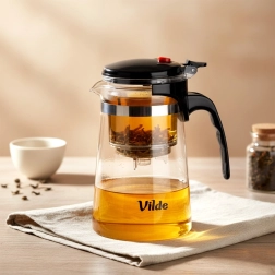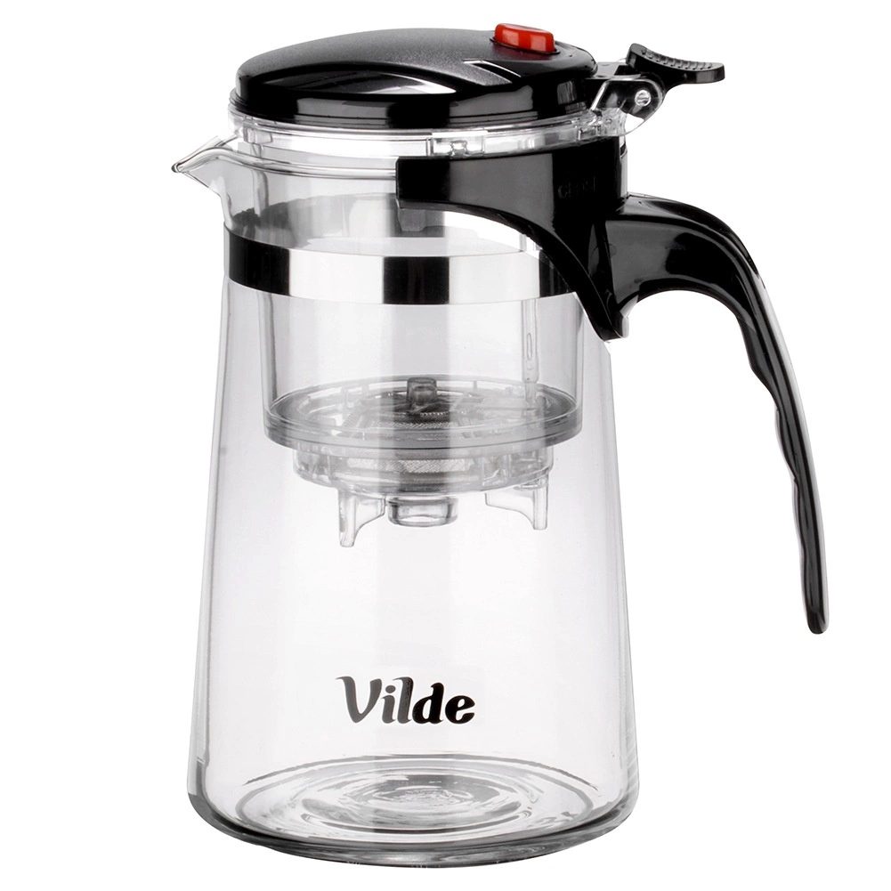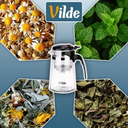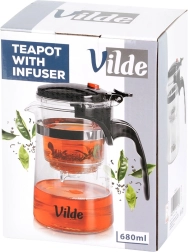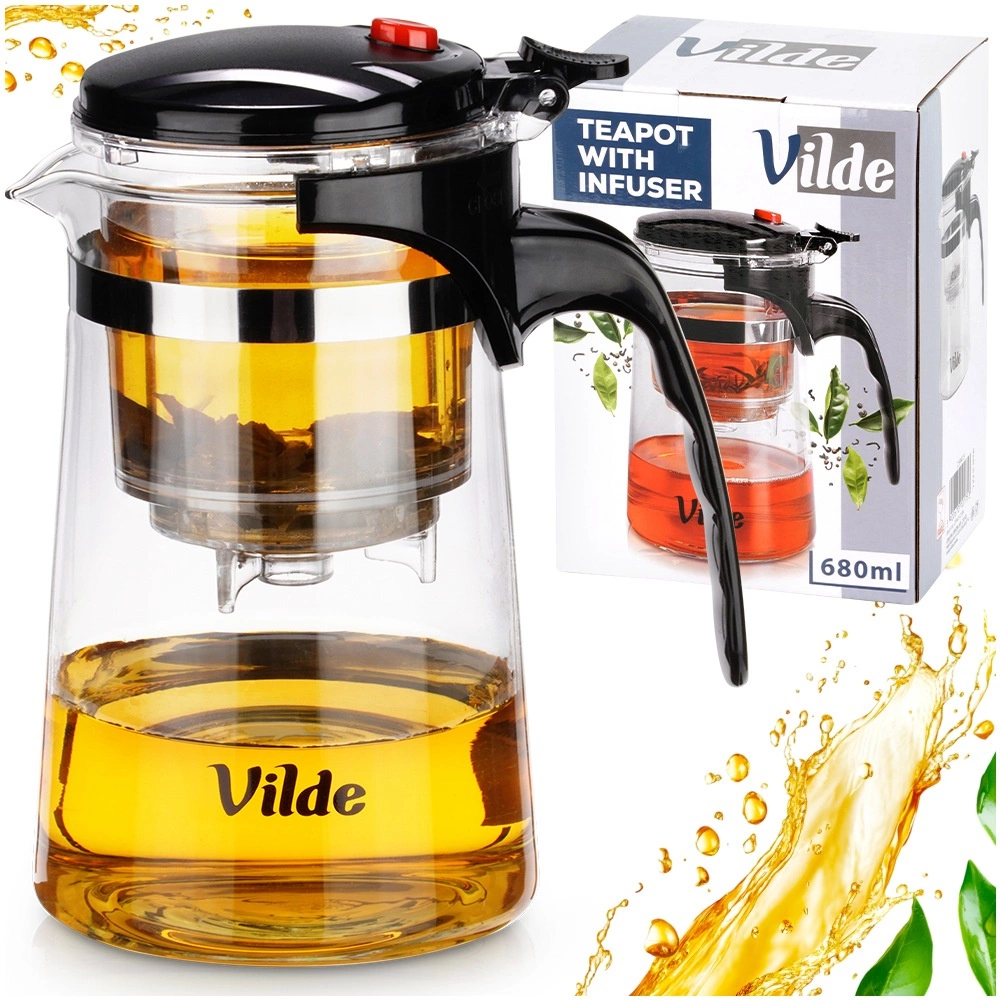 Praktyczny szklany dzbanek z systemem dozującego zaparzacza do przygotowywania herbat liściastych, ziół i naparów owocowych. Dzięki przezroczystemu szkłu borokrzemowemu możesz obserwować proces parzenia i jednym naciśnięciem uwolnić gotowy napar do dolnego dzbanka. Pojemność 680 ml jest idealna do codziennego użytku, odporne szkło borokrzemowe wytrzymuje temperatury od -20 °C do 120 °C, a wygodne nalewanie zapewniają ergonomiczny uchwyt i dzióbek. Oryginalny produkt marki VILDE.