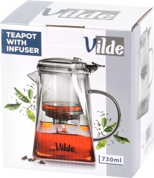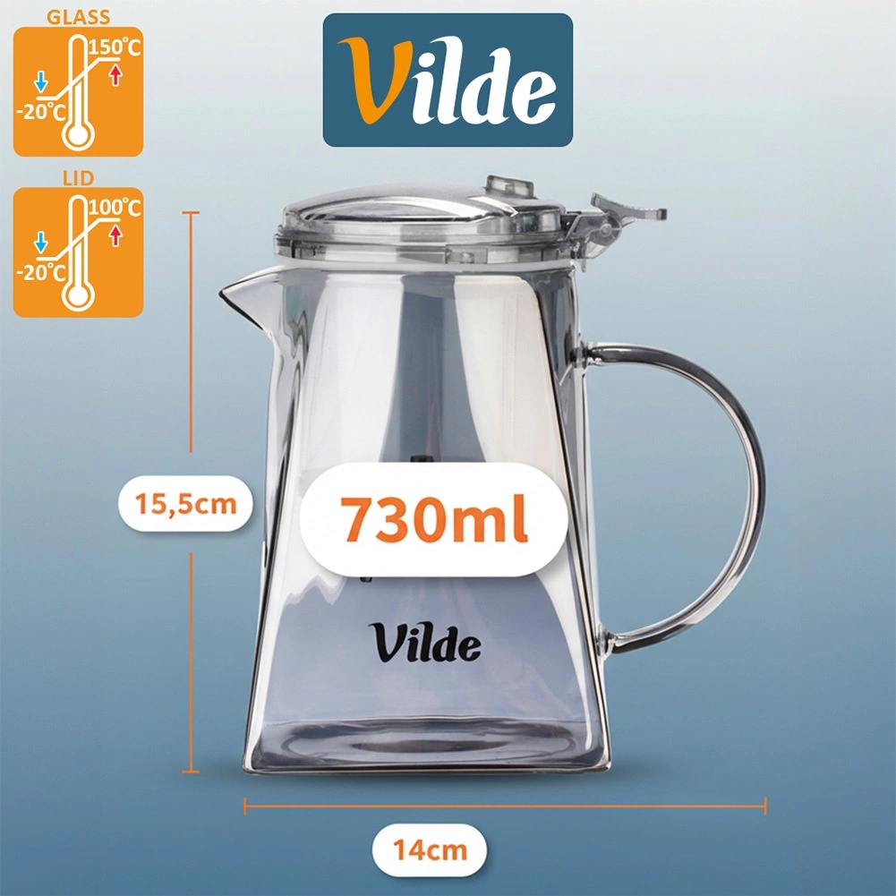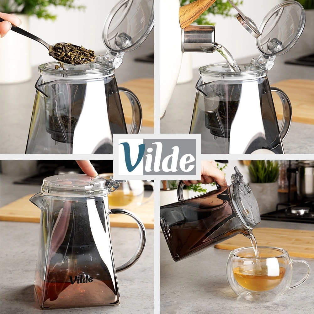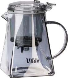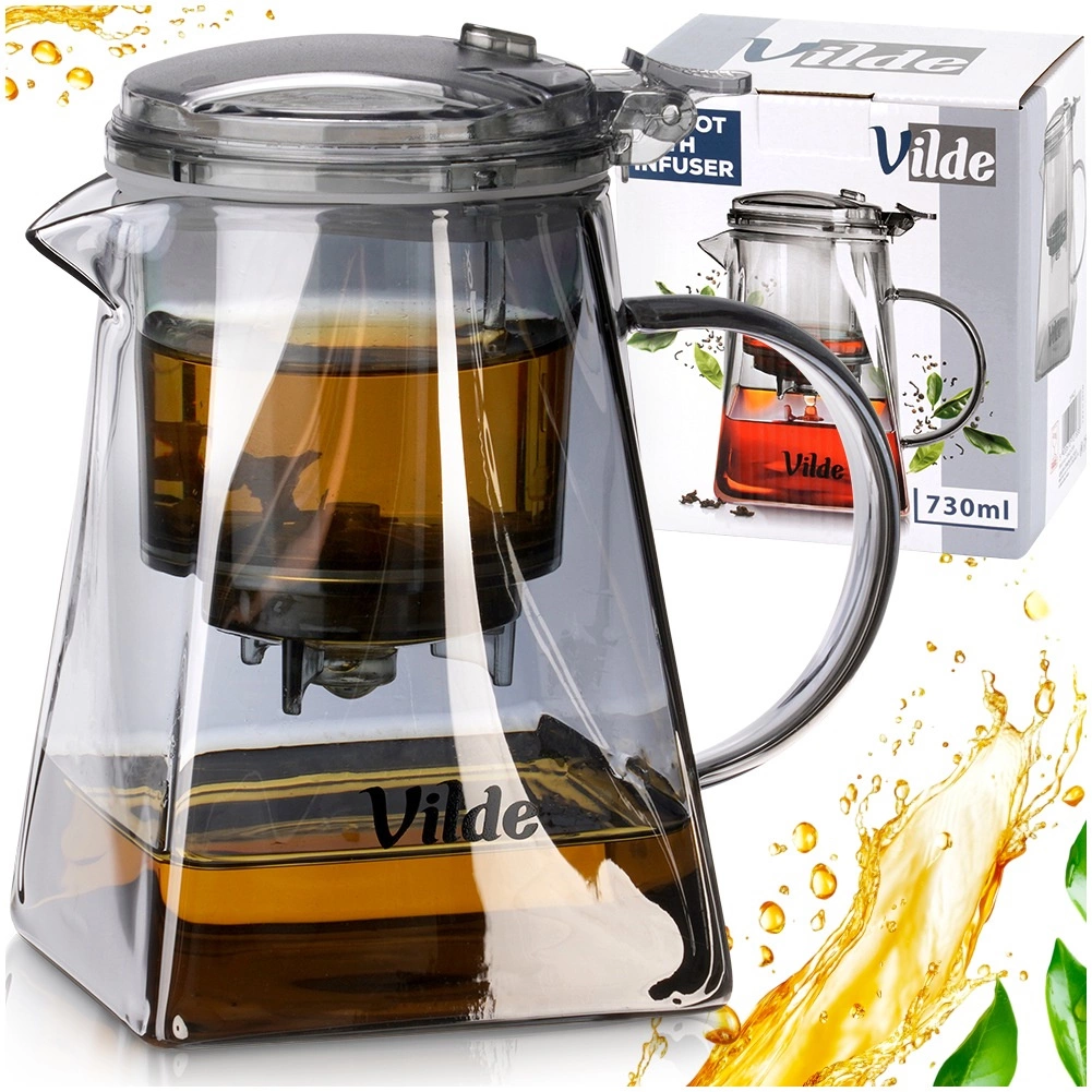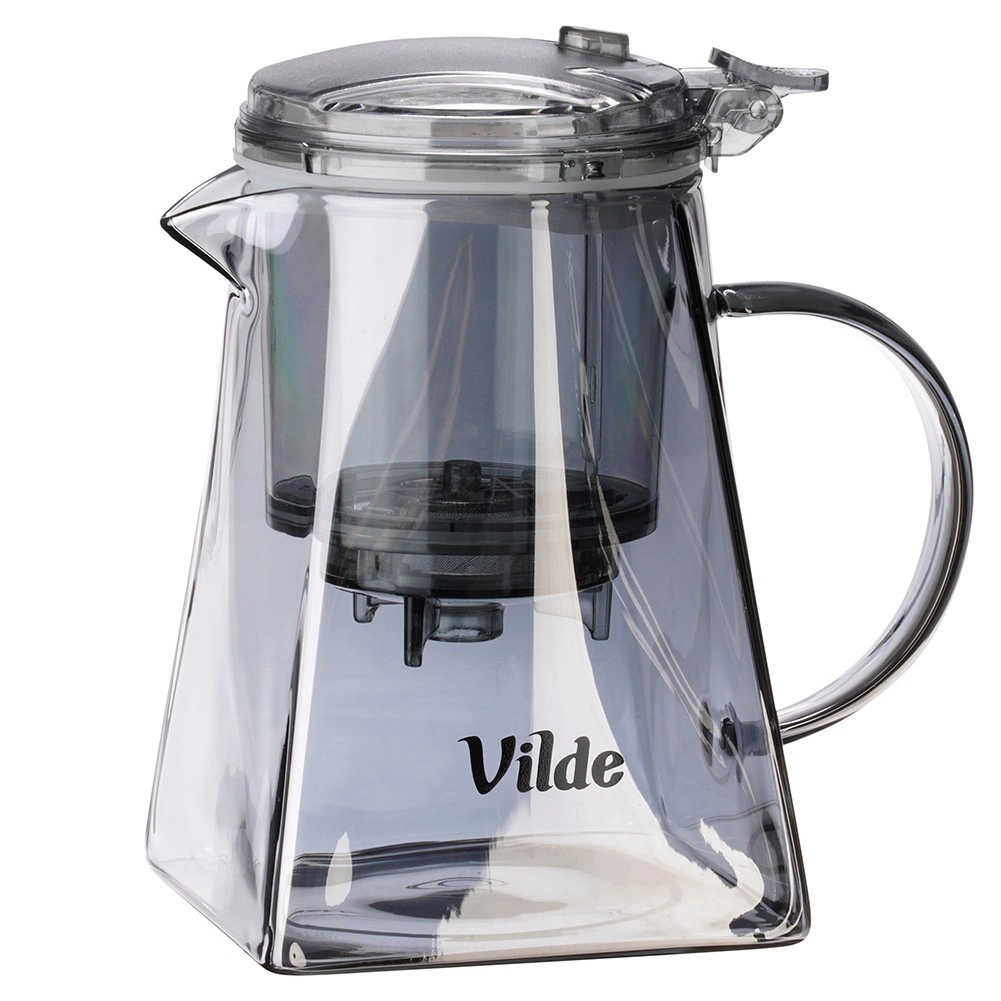 Korpus z borokrzemowego szkła jest lekki, trwały i odporny na temperaturę. Kwadratowa podstawa z stożkowym kształtem zapewnia stabilność i oryginalny wygląd. Praktyczna pokrywka i zaparzacz z wysokiej jakości tworzywa są transparentne w dymnym, czarnym odcieniu. Szeroki wlew ułatwia napełnianie i czyszczenie, a ergonomiczny uchwyt — wygodne nalewanie.