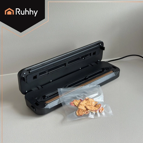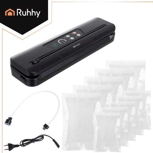 Zgrzewarka próżniowa RUHHY ułatwia domowe pakowanie żywności, ogranicza marnowanie i wydłuża świeżość mięsa, serów, warzyw oraz dań marynowanych. Mocna pompa próżniowa 80 kPa o mocy 110 W i przepływie 9 l/min tworzy profesjonalne, szczelne zgrzewy w kilka sekund. Czytelne wskaźniki LED i prosta obsługa gwarantują niezawodny efekt za każdym razem.