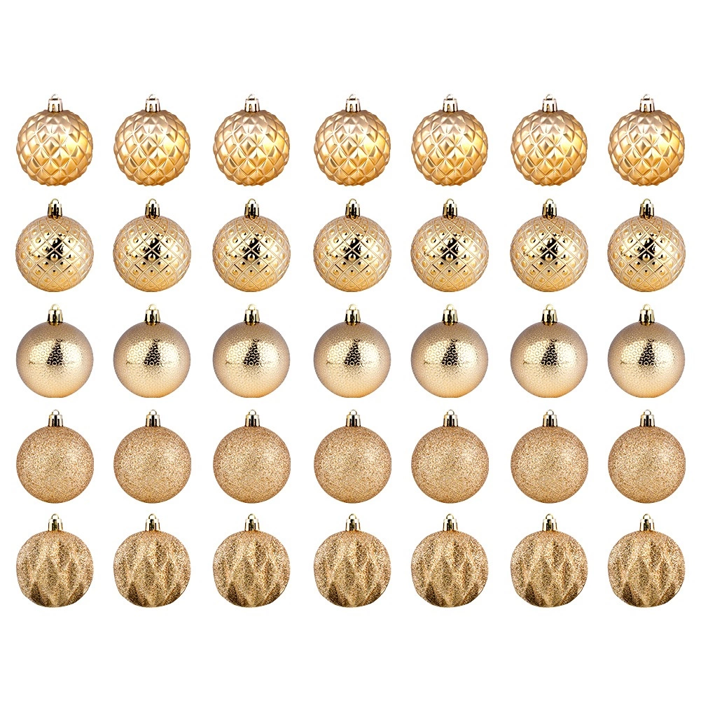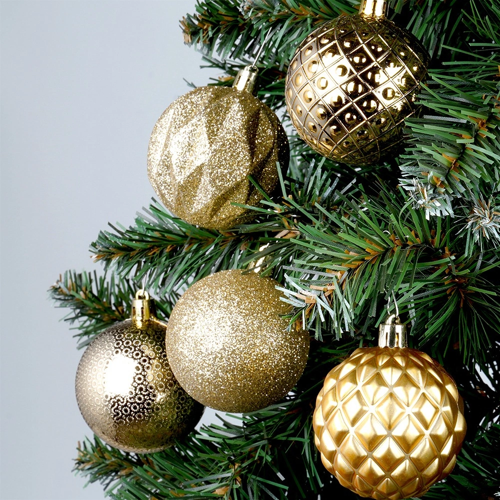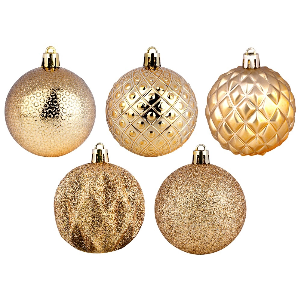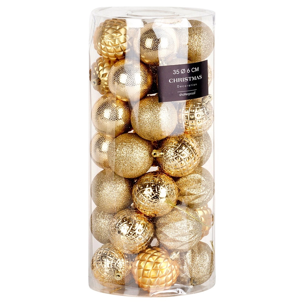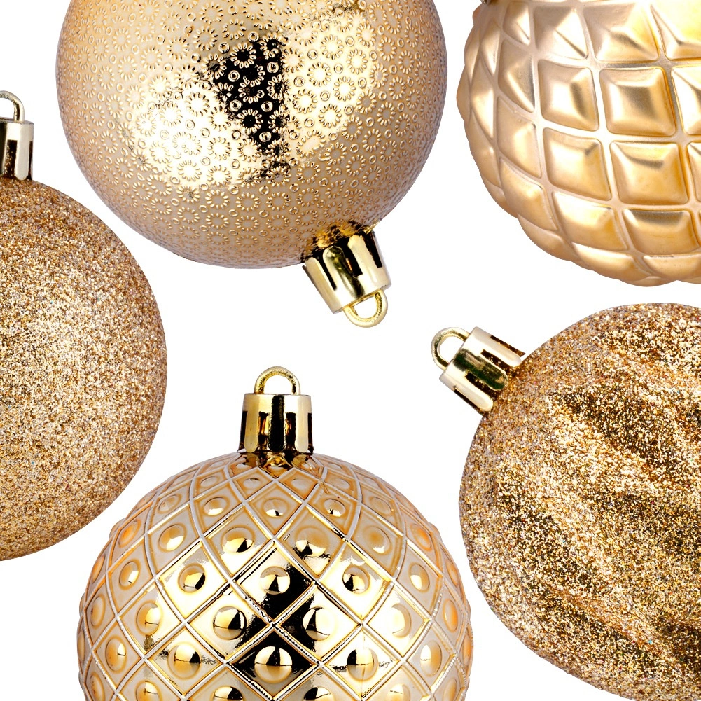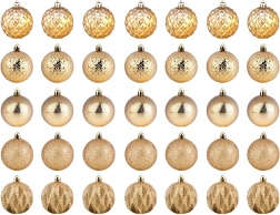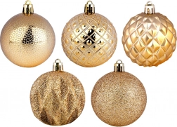 Stwórz magiczną, świąteczną atmosferę ze stylowym zestawem złotych bombek, które łączą różne tekstury i efekty dla bogatego, wizualnie atrakcyjnego wyglądu. Od gładkiego połysku, przez mat, po iskrzący brokat i plastyczne reliefy – każdy element doda świątecznym dekoracjom niepowtarzalnego charakteru.
