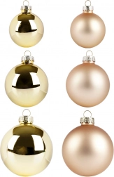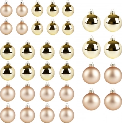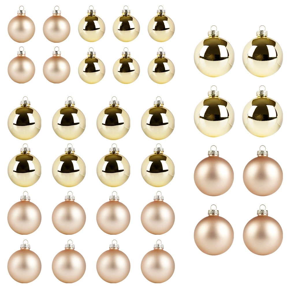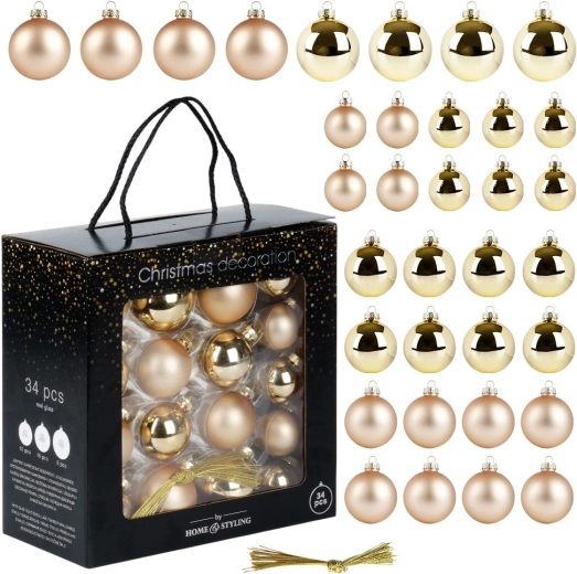 Elegancki zestaw 34 szklanych bombek świątecznych w odcieniach złota łączy błyszczące i matowe wykończenie, tworząc harmonijny i luksusowy wygląd Twoich dekoracji bożonarodzeniowych. Różne średnice 4, 5 i 6 cm zapewniają idealne rozmieszczenie na choince, wiankach i girlandach, tworząc magiczną świąteczną atmosferę.