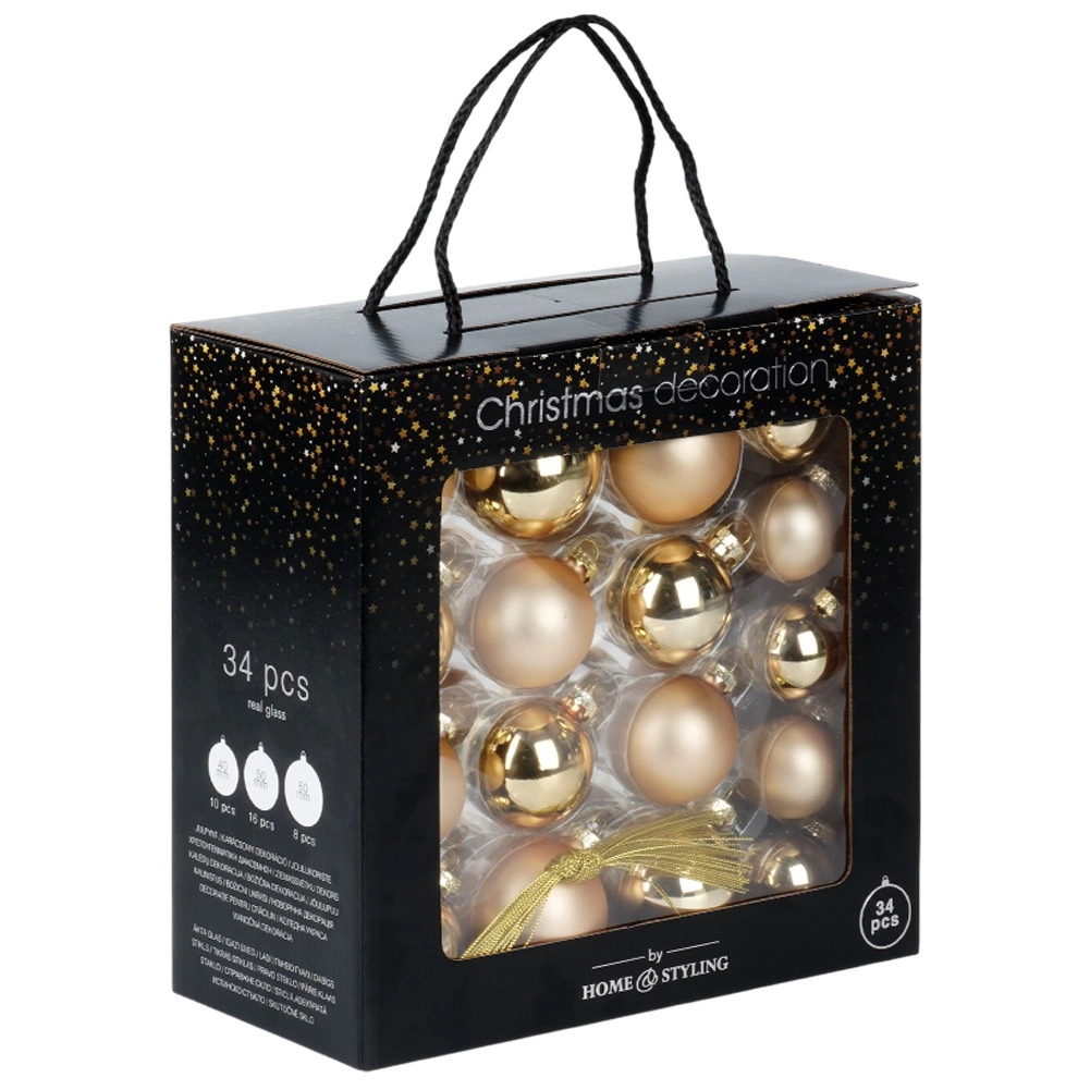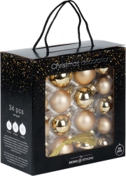 Zestaw zawiera 34 precyzyjnie wykonane szklane ozdoby w złotym kolorze, które dodają każdemu wnętrzu nuty elegancji. Połączenie matowego i błyszczącego wykończenia tworzy efektowny kontrast i pięknie odbija światło łańcuchów świetlnych.