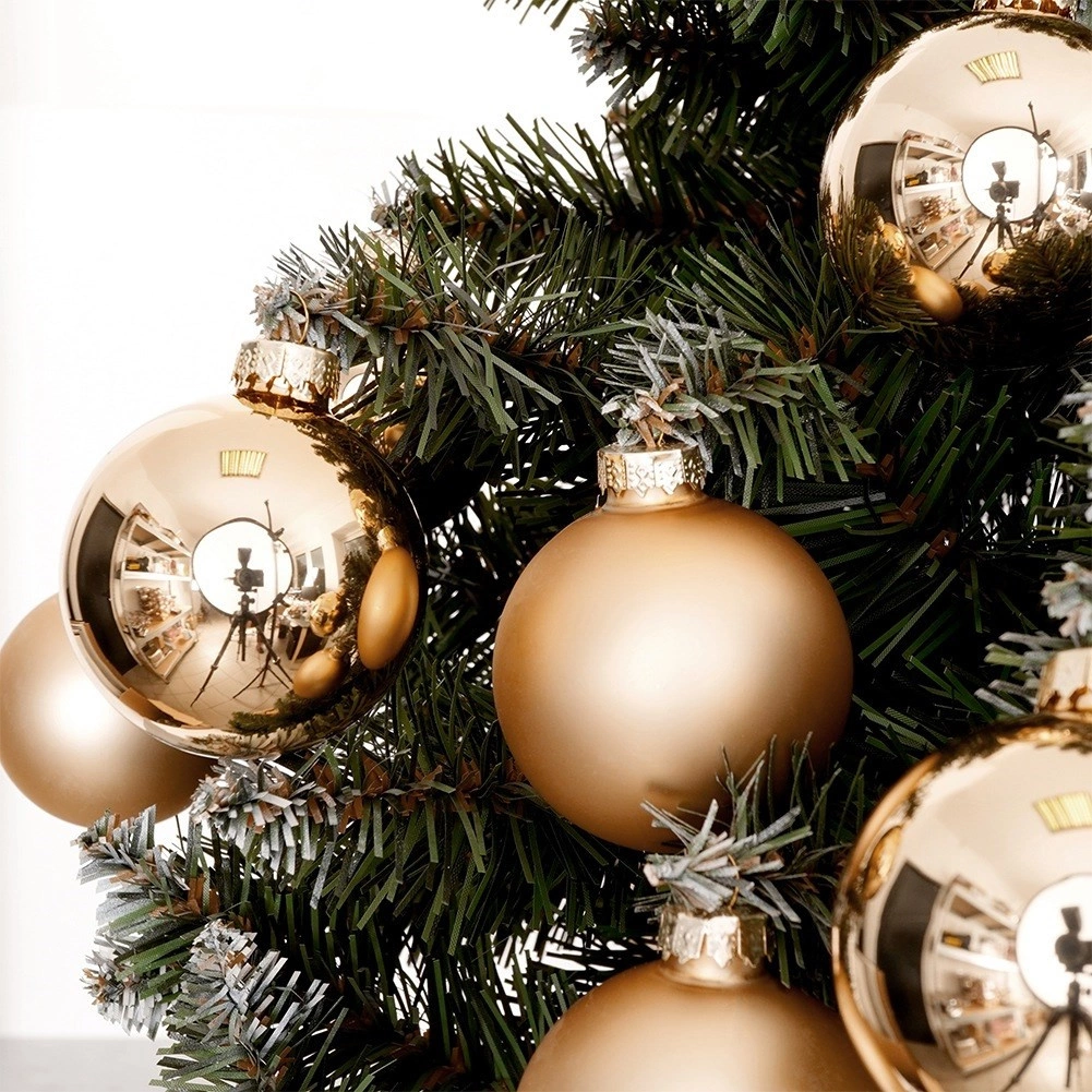Zestaw łączy błyszczące i matowe złote bombki, które wspólnie tworzą zrównoważoną grę światła i faktur na Twojej choince.