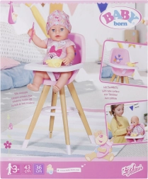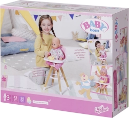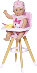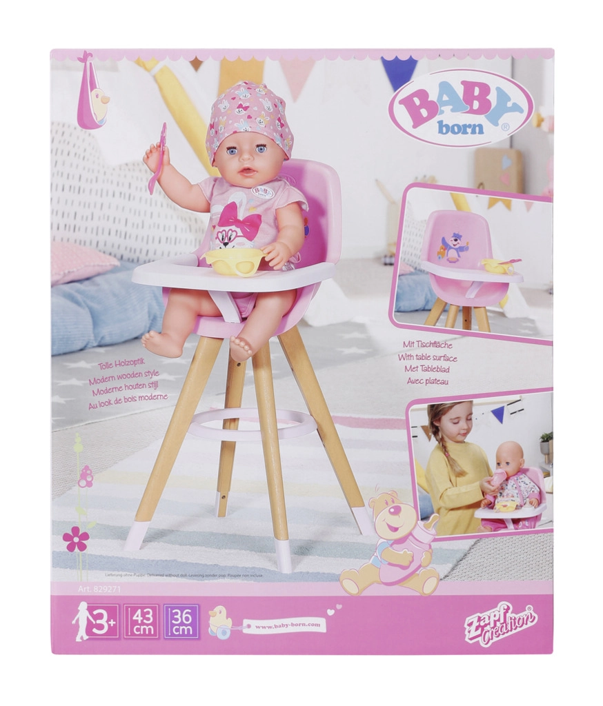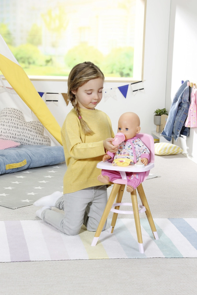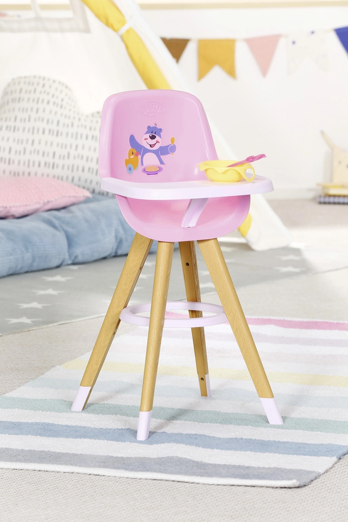 Stylowe krzesełko do karmienia dla lalek BABY born w skandynawskim stylu zapewnia dzieciom kreatywną zabawę w karmienie. Ma stabilne nogi w wyglądzie drewna, wygodne różowe siedzisko oraz zdejmowany stolik z wystarczającą ilością miejsca na talerzyk, buteleczkę i inne akcesoria. Uroczy nadruk z misiem i kaczuszką ucieszy małych opiekunów, a krzesełko pasuje także do mniejszych lalek.