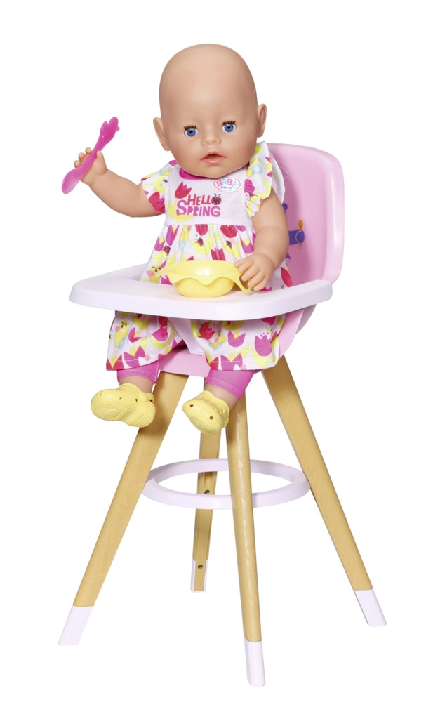 To nowoczesne krzesełko do karmienia dla lalek BABY born łączy skandynawski wygląd z funkcjonalnym wykonaniem do codziennej zabawy. Stabilne, szeroko rozstawione nogi o drewnianym wyglądzie oraz okrągły podnóżek zapewniają pewność przy serwowaniu pyszności. Różowe siedzisko z wysokim oparciem i uroczym nadrukiem gwarantuje lalce wygodne siedzenie.