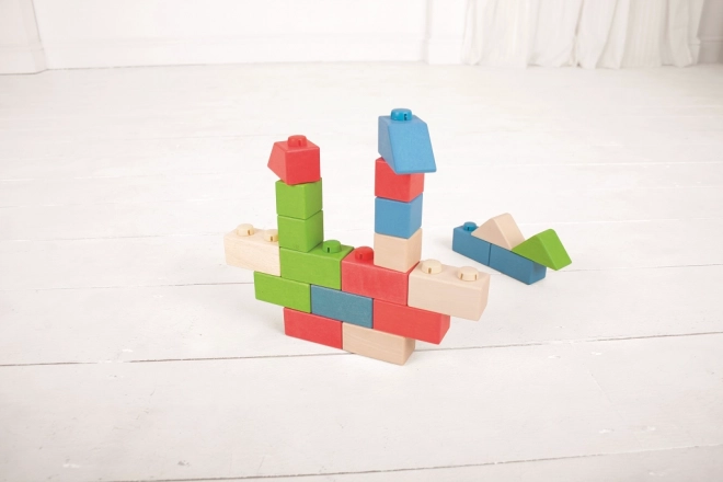 Drewniane klocki z plastikowymi łącznikami umożliwiają tworzenie solidnych i stabilnych struktur.