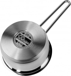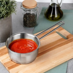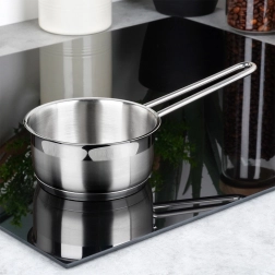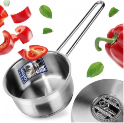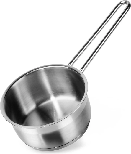 Praktyczny rondel z wysokiej jakości stali nierdzewnej w eleganckim srebrnym kolorze wyróżnia się trwałością i uniwersalnością. Dzięki kompaktowym wymiarom świetnie sprawdzi się do podgrzewania mleka, sosów czy dodatków, a także doskonale pasuje do mniejszych kuchni.