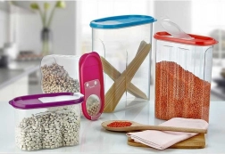 Pojemnik wykonano z wysokiej jakości plastiku BPA free, spełniającego europejskie standardy. Odpowiedni do mąki, cukru, kaszy manny, ryżu, roślin strączkowych, płatków i innych sypkich składników. Pokrywka dostępna w różnych kolorach (wysyłamy losowo). Takie same pojemniki można praktycznie sztaplować.