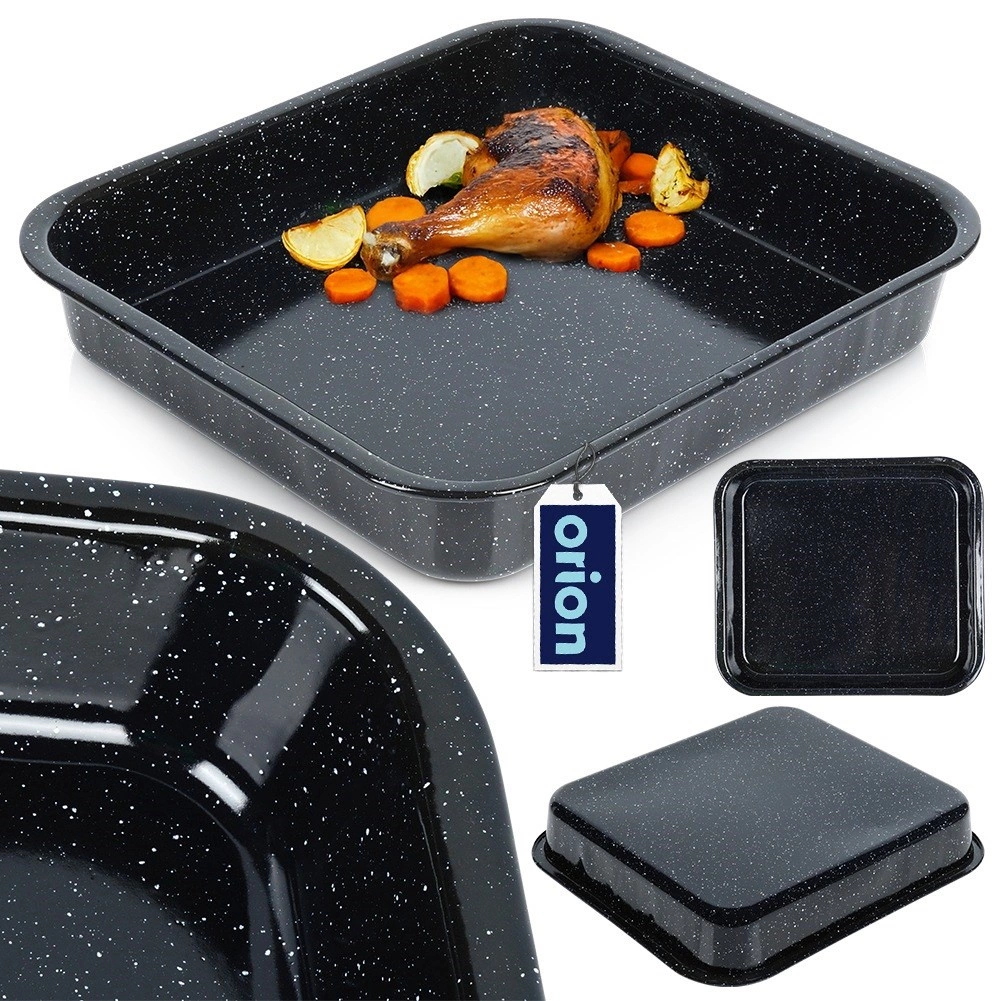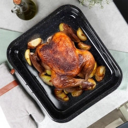 Pojemna emaliowana brytfanna o objętości 8 litrów i wymiarach 41,5 × 36,5 × 7 cm jest idealna do pieczenia i zapiekania mięsa, warzyw oraz deserów. Wysokiej jakości powłoka emalierska jest bezpieczna dla zdrowia, nieprzywierająca i łatwa w czyszczeniu. Odpowiednia do piekarników gazowych i elektrycznych, można myć w zmywarce.