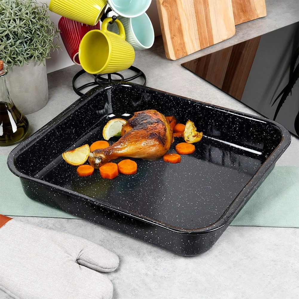 Trwała i uniwersalna brytfanna z wysokiej jakości emaliowanej stali w kolorze czarnym to doskonały wybór do codziennego gotowania. Dzięki dużej pojemności 8 l oraz wymiarom wewnętrznym 38 × 34 × 7 cm wygodnie przygotujesz pieczone mięsa, warzywa, domową pizzę z wysokim rantem czy sycące zapiekanki. Powłoka emaliowana jest bezpieczna dla zdrowia i odpowiednia również dla alergików.