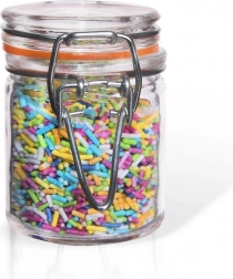 Słoik wykonany jest z wysokiej jakości grubego szkła, klips z trwałego metalu, a pomarańczowa gumowa uszczelka zapewnia niezawodne zamknięcie. Dzięki eleganckiemu wyglądowi nadaje się również jako dekoracyjne opakowanie na domowe upominki, na przykład na dżemy lub aromatyzowane sole.