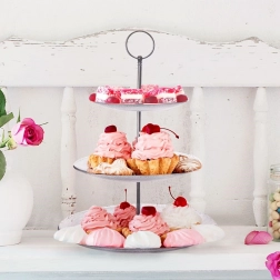 Szklany etażer z trzema poziomami to doskonały wybór do serwowania babeczek, ciasteczek, deserów, owoców oraz słonych przekąsek. Talerze o różnych rozmiarach umożliwiają przejrzyste i efektowne aranżacje, które ozdobią każdy stół okolicznościowy, sweet bar czy bufet.