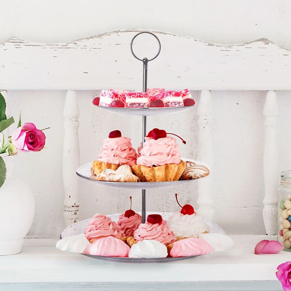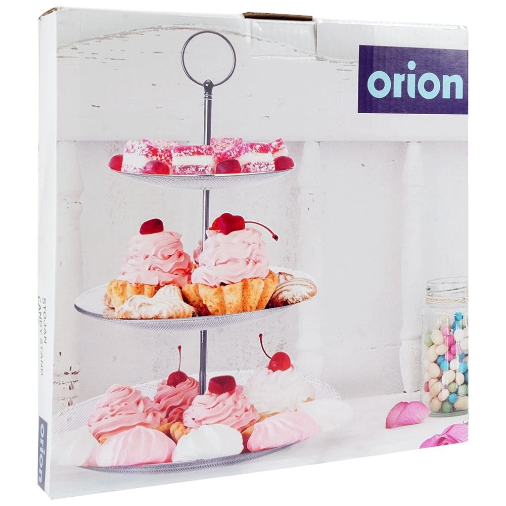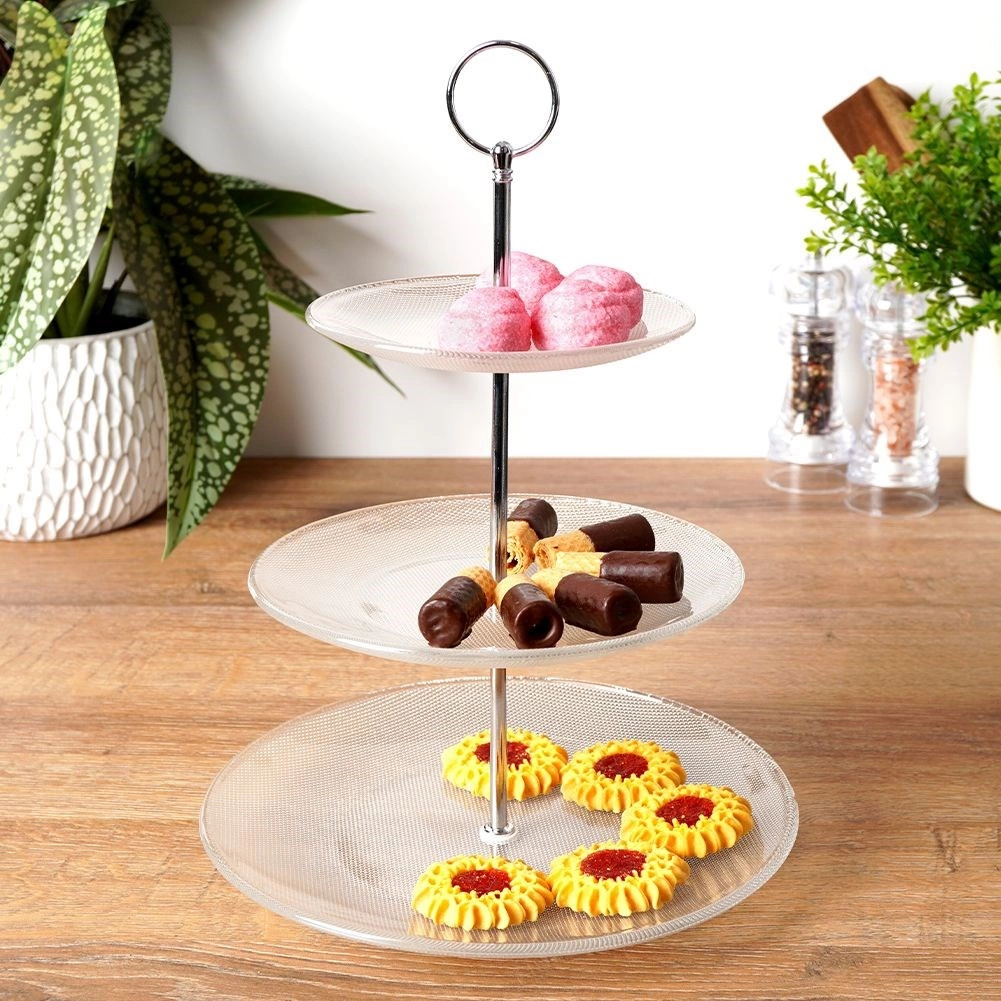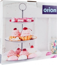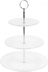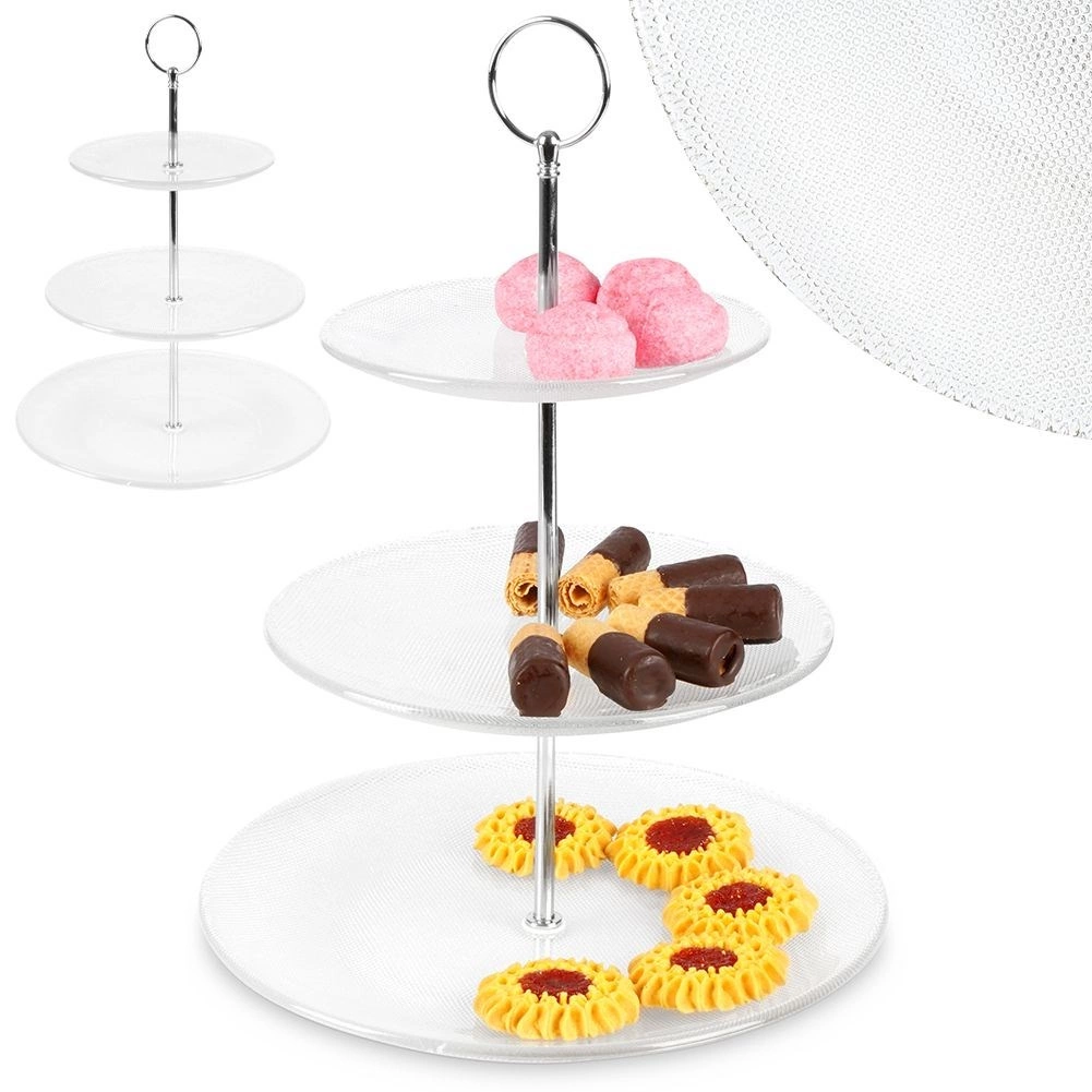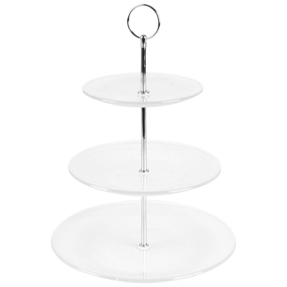 Elegancki trzypoziomowy etażer o wysokości 33 cm do stylowego serwowania deserów, owoców i przekąsek. Wykonany z wysokiej jakości szkła z metalowym uchwytem ze stali nierdzewnej w kolorze srebrnym. Dzięki trzem talerzom o różnych średnicach stworzysz efektowną prezentację smakołyków na każdym stole. Dekoracyjny, praktyczny i łatwy w czyszczeniu – idealny do użytku domowego i profesjonalnego.