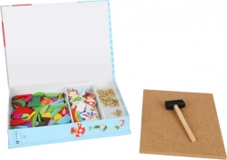 Ten kreatywny zestaw z młotkiem i wróżkami zapewnia dzieciom godziny twórczej zabawy. Elementy z nawierconymi otworami łatwo mocuje się za pomocą gwoździków do solidnej korkowej tablicy, tworząc bajkowe sceny pełne kwiatów, wróżek i grzybków. Poręczny drewniany młotek wygodnie leży w dłoni, a praca z nim jest bezpieczna i intuicyjna.