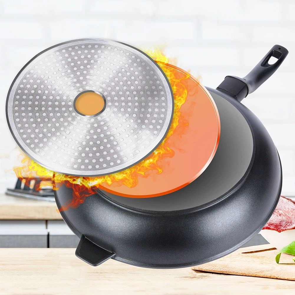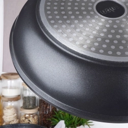 - Równomierna dystrybucja ciepła – szybkie i oszczędne smażenie oraz duszenie.